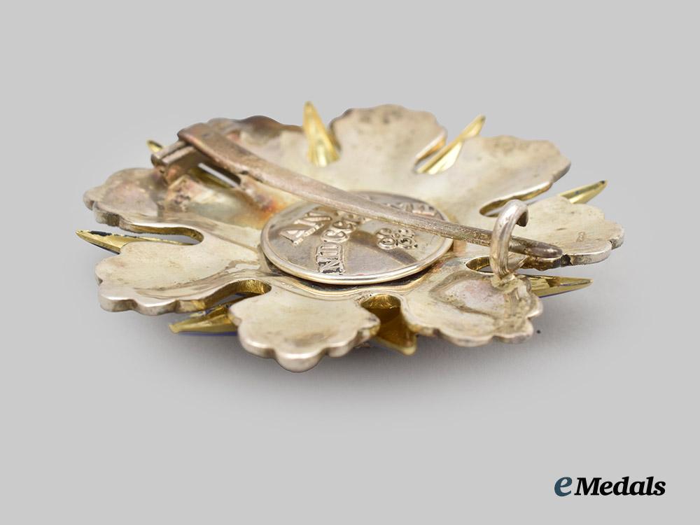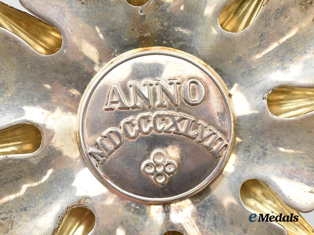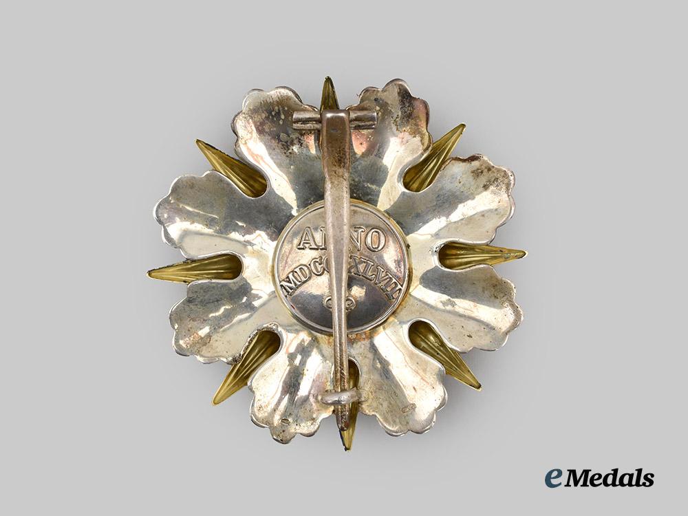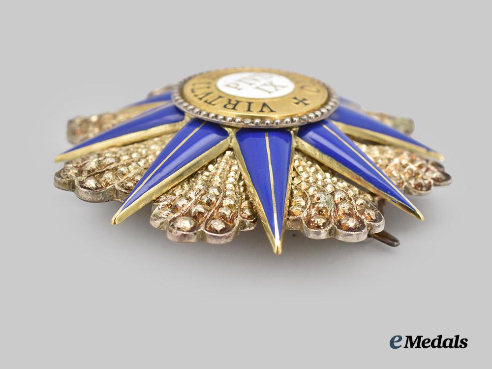 (Ordine di Pio IX). Instituted June 17th, 1847. In silver gilt, an eight point star of blue rays, with cluster of five faceted undulating rays in each quadrant, the obverse medallion in Gold presenting PIVS IX in white enamel encircled by the inscription VIRTVTI ET MERITO, the reverse presents a single vertical pin, the medallion bearing ANNO MDCCCXXLVII, measures 70.9 mm (w) x 68.9 mm (h), weighs 87.9 grams, marked 925 on the pin and reverse base, marked 342ROMA on the base, in extremely fine condition.