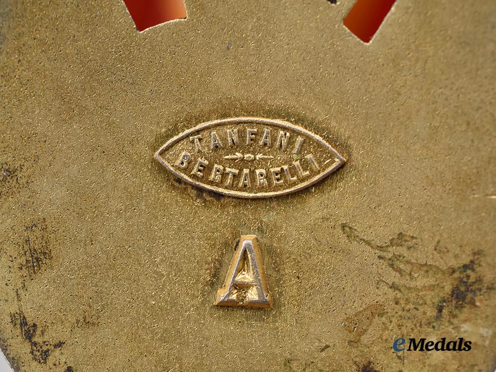 (Ordo Sancti Gregorii Magni/Ordine di San Gregorio Magno). Three piece construction, consisting of a Maltese Cross with ball finials, the obverse with a central blue enameled circular disc bearing the leftward facing bust of St. Gregory, circumscribed “Gregorius Magnus” in capitalized lettering, the reverse with a similar central blue enameled circular disc inscribed “Pro Deo et Principe” (For God and Ruler) in capitalized lettering, circumscribed “Gregorius” in matching capitalized lettering, suspended from a Coat of Arms in gilded silver, on a broad ring for suspension from its original neck ribbon, makers marked on the back of the trophy of arms with "Tanfani & Bertarelli - A”, measuring 55.6 mm (w) x 99.9 mm (l), weighing 44.8 grams, bright and perfect enamels, there is some patina on the trophy of arms of the award, in overall better than very fine condition.