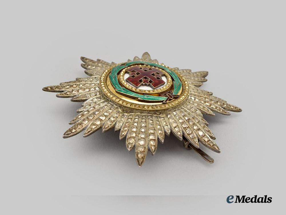 (Ordo Equestris Sancti Sepulcri Hierosolymitani). Instituted in 1099. An eight-pointed silver star, each point made of three longer rays with three rayed arms in each corner, obverse centerpiece bears the Jerusalem cross in red enamel on a white background, surrounded by a green enamelled wreath tied together with a red bow at the bottom, reverse bears a single vertical pin assembly, measures 87.3 mm (w) x 87.7 mm (h), enamels all intact, extremely fine condition.