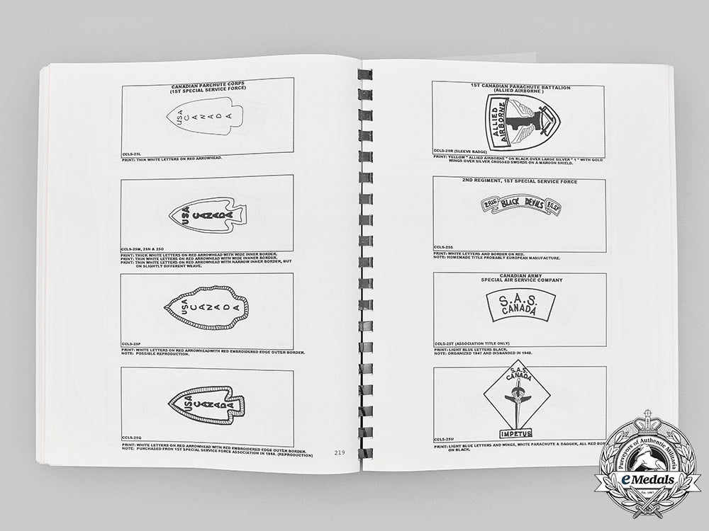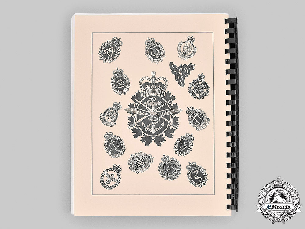 Part I: Canadian Corps Troops by William C. Hampson, CD, BA, MEd; Softcover, entitled "A Catalogue of Twentieth-Century Canadian Military Cloth and Metal Shoulder Titles 1900 to 1999, Part I: Canadian Corps Troops", thoroughly researched and written by William C. Hampson, CD, BA, MEd of Calgary, Alberta, self-published and printed in Canada, illustrations by William C, Hampson & Oliver R. Hampson, ISBN-0-9685714-0-9. It contains twenty-nine chapters: I - Roll of Corps Troops 1870-1999; II - Royal Regiment of Canadian Artillery; III - Royal Canadian Engineers; IV - Royal Canadian Signals Corps; V - Royal Canadian Army Service Corps; VI - Royal Canadian Army Medical Corps; VII - Royal Canadian Army Dental Corps; VIII - Royal Canadian Ordnance Corps; IX - Royal Canadian Electrical Mechanical Engineers; X - Royal Canadian Army Pay Corps; XI - Canadian Intelligence Corps; XII - Royal Canadian Chaplain Corps; XIII - Royal Canadian Postal Corps; XIV - Canadian Provost Corps; XV - Canadian Parachute Corps; XVI - Canadian Metal Shoulder Titles 1900-14; XVII - Cloth & Metal Shoulder Titles 1914-20; XVIII - Canadian Metal Shoulder Titles 1920-50; XIX - Canadian Forces Metal Shoulder Titles 1950-60; XX - Canadian Forces Metal Shoulder Titles 1986-96; XXI - Canadian Forces Combat Shoulder Titles 1986-99; XXII - Canadian Khaki Shoulder Titles 1939-41; XXIII - Canadian Canvas Shoulder Titles 1943-45; XXIV - Canadian Corps Cloth Shoulder Titles; XXV - Royal Canadian Artillery Cloth Shoulder Titles; XXVI - Canadian Forces Embroidered Edge Shoulder Titles; XXVII - Pacific Coast Militia Rangers 1943-45; XXVIII - Canadian Rangers Units; XXIX - Saskatchewan Civil Security Corps. The catalogue concludes with an Extended Table of Contents and five pages featuring a list of Reference Books. It contains 472 pages and is loaded with multiple line illustrations of both cloth and metal shoulder titles, along with full lists of every Canadian Corps unit that has participated for Canada from 1900 to 1999. The text and illustrations are printed in black ink on a white paper stock, the dividers and covers on a beige paper stock, clear plastic front and back protective covers, black plastic spiral-bound, measuring 216 mm (w) x 280 mm (h) x 33 mm (d). Crease evident in the front clear plastic protective cover, the pages remaining unaffected. Near extremely fine.