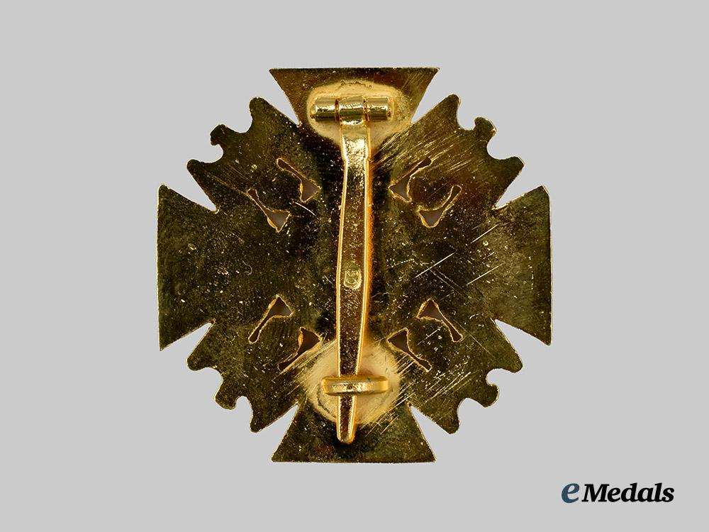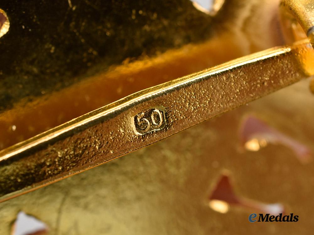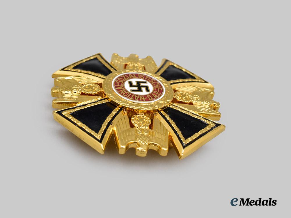 (Deutscher Orden der NSDAP, Kreuz III. Klasse, Museumsstück). Constructed of a gilded alloy with multi-coloured enamels, consisting of a Cross Pattée with black enameled arms, the obverse of each trimmed with a raised and gilded oak leaf border, joined through the quadrants by a double-sided NSDAP-style German national eagle clutching a wreathed mobile swastikas, bearing a central NSDAP membership badge consisting of a white enameled medallion overlaid by a black mobile swastika, situated within a dark red enameled ring bearing a gilt inscription of “NATIONAL-SOZIALISTISCHE D.A.P.”, in turn surrounded by a gilded oak leaf wreath,the reverse with barrel hinge and vertical pinback meeting a flat wire catch, the pinback maker marked with a number “50”, likely indicating the wartime LDO code for Gebrüder Godet, Berlin, measuring 48.20 mm (w) x 48.24 mm (h), weighing 36.7 grams, a high-quality example produced for collector display in near mint condition.
