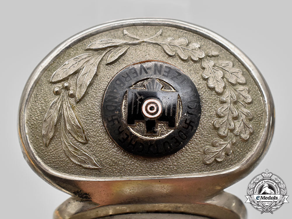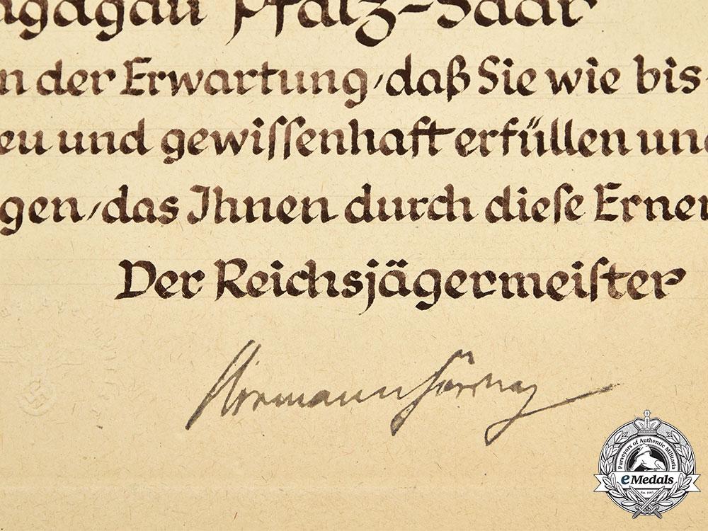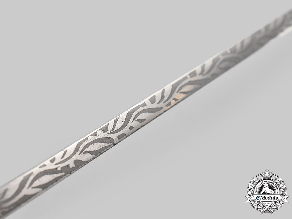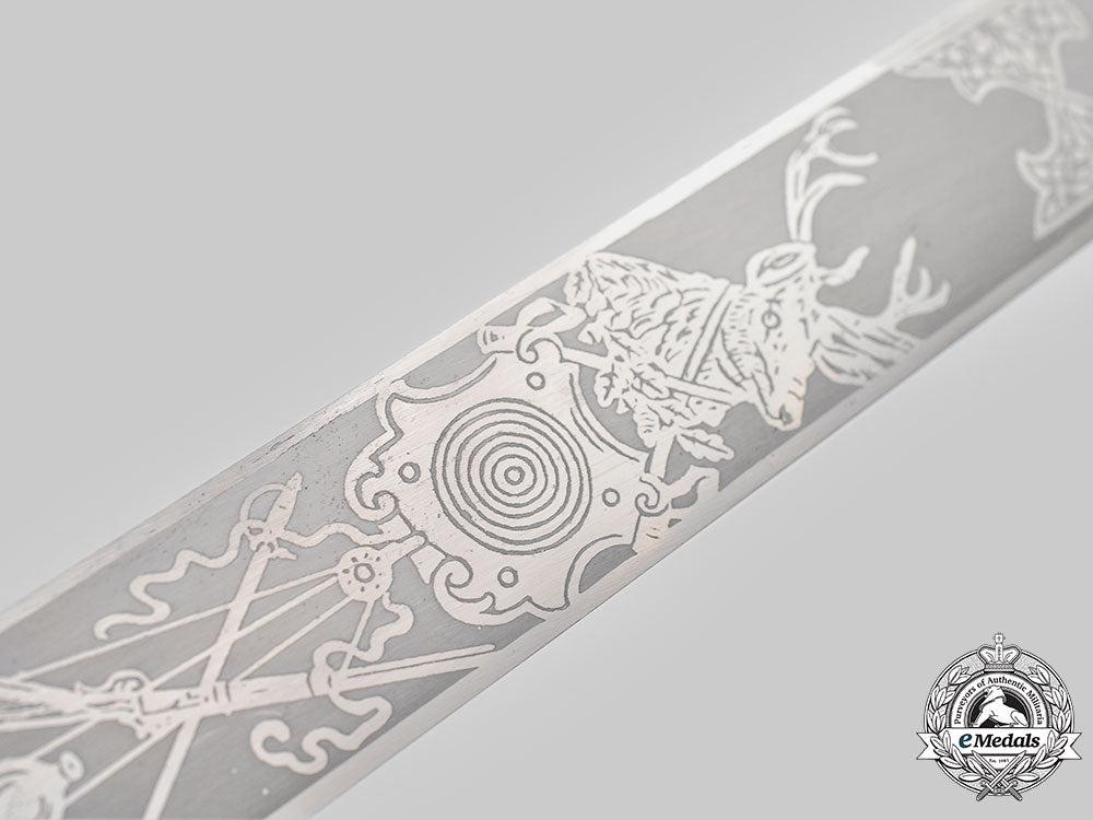 (Deutsches Jägerschaft Dolch für Gaujägermeister mit Verleihungsurkunde). A rare and striking Deutsches Jägerschaft (German Hunting Association/DJ) Gaujägermeister presentation dagger awarded to General der Kavallerie Curt Ludwig Freiherr von Gienanth, measuring 54.5 cm in total length when inserted into the scabbard. It features a 41 cm-long polished magnetic steel blade with a sharpened tip and lower edge. Acid-etched onto the obverse of the blade is an intricate design consisting of a central bullseye target, topped by a stag’s head and above hunting imagery consisting of a crossed rifle and sabre with a canteen. It is in turn surrounded by arabesque and forestry-themed designs. The reverse of the blade features additional acid-etched forestry- and hunting-themed imagery executed with similar precision. The reverse ricasso also bears a maker’s mark of “CARL JULIUS KREBS, SOLINGEN”, circumscribing the firm’s logo. It sits within a nickel-plated crossguard taking the form of dual acorns, with the seam covered by an intact dark green wool buffer pad. The obverse of the crossguard features a clamshell-style decoration which features a central Deutscher Schützen-Verband (German Shooting Association) insignia, constructed of silvered and enameled bronze, and set within a semi-oval laurel and oak leaf wreath. The handle grip is composed of a single piece of ribbed and marbled celluloid, with the obverse bearing a crossed rifle insignia. It completes with a flattened and rounded pommel with a protruding stud with a slot for tightening and loosening as required. The dagger is accompanied by its period original scabbard, constructed of a pressed black leather shaft securely closed together by heavy stitching along the seam. Magnetic metal fixtures are fastened to both the tip and throat with staple rivets. The throat features an engraved dedication of “FREIH. V. GIENANTH, ZUR ERINNERUNG ALS GAU JÄGERMEISTER, 1. 2. 35, DER VORSTAND DES DEUTSCHEN SCHÜTZEN VERBANDES”, with a protruding stud for the accommodation of a frog. The structure of the dagger has loosened throughout the crossguard and handle, and the scabbard does not fit flush with the base of the blade, but the dagger demonstrates no damage or wear and remains in a near extremely fine condition. It is accompanied by an award folder, constructed of a large card stock binding with a field-grey canvas exterior liner. The cover bearing a silvered and embossed German Hunting Association insignia. The interior of the cover is pasted with a studio portrait of von Gienanth in a DJ uniform, with an NSDAP membership badge clearly visible. Measuring 102 mm (w) x 150 mm (h), the portrait is pasted to a card stock backer bearing a raised Kaiserslautern studio mark in the lower right corner. The opposite side features an exceptionally-detailed black ink award document. Topped by a depiction of a herd of deer in a forest and flanked by a DJ insignia, the document features a dedication to von Gienanth in his capacity as Gaujägermeister of Jagdgau (Hunting District) Pfalz-Saar, closing with a date of “1. 2. 35.” and notably featuring the handwritten signature of Hermann Göring in his capacity as Reichsjägermeister (Reich Master of the Hunt). It measures 37.5 cm (w) x 48 cm (h). Demonstrating only minor discolouration consistent with age and storage, the binder is in an overall extremely fine condition. Footnote: Curt Ludwig Freiherr von Gienanth was born on 6 December 1876 in Eisenberg, Germany. He joined Garde-Dragoner-Regiment (1. Großherzoglich Hessisches) Nr. 23 as a cadet on 23 March 1896, rising through the ranks of various cavalry units before joining 1. Kavallerie-Division as a Staff Officer. He held various assignments, culminating in a posting to Constantinople (Istanbul) as a member of the German Military Commission to the Ottoman Empire. He remained in Reichswehr service with cavalry units throughout the 1920s and 1930s, before being officially recalled to Wehrmacht service and appointed as Commander of Fortress Breslau. He was withdrawn from active service on 1 October 1942 and transferred to the Führerreserve, before officially being demobilized on 30 June 1943. For his wartime service, von Gienanth was a recipient of the German Cross in Silver. He survived the war and died in Heidelberg on 3 April 1961.