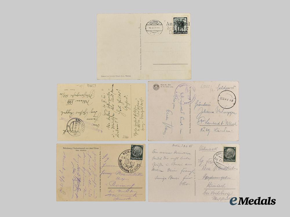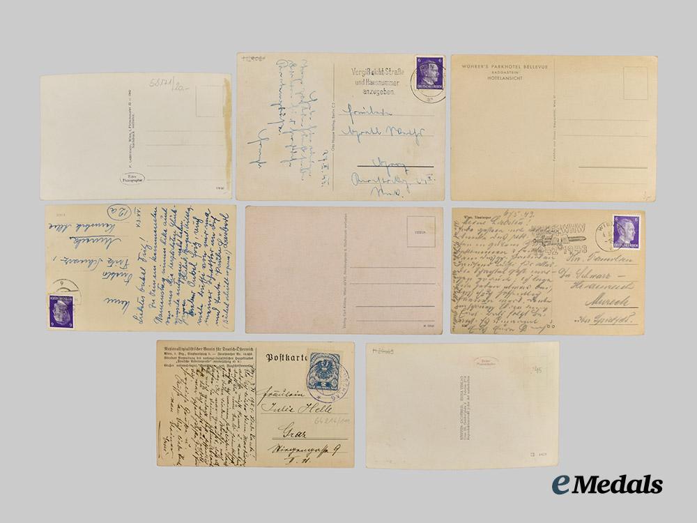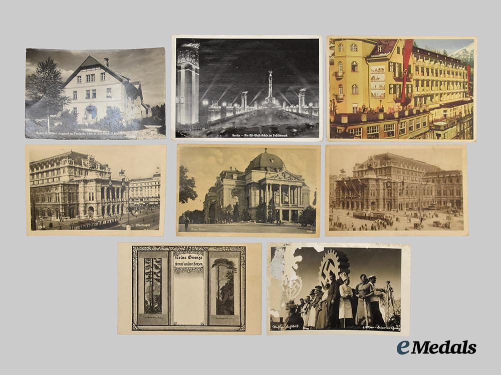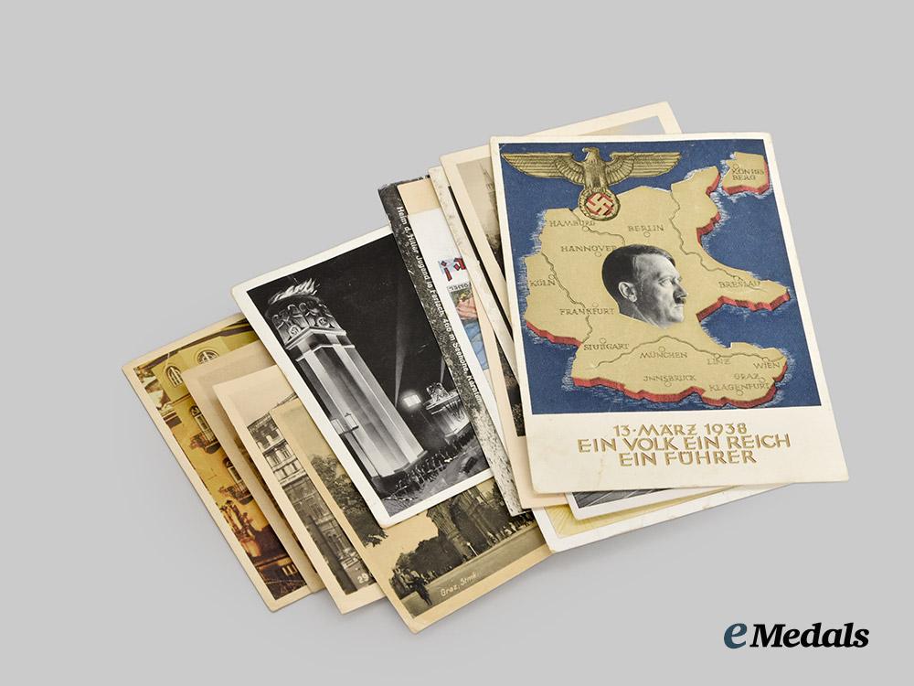 (Postkarten). A mixed lot of 13 patriotic postcards, each featuring photographs or illustrations executed in both colour and black-and-white, with images featuring an emphasis on Germanic and National Socialist architecture and artwork, most bearing extensive handwritten inscriptions on the reverse, in overall extremely fine condition.