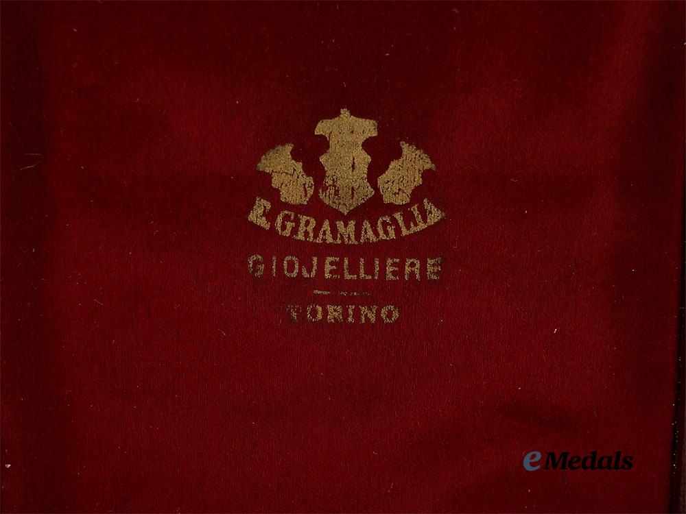 Accompanied by its presentation case, in red leatherette exterior with the superimposed crowned cypher of Victor Emmanuel, the interior lid with a red coloured silk cover marked E. GRAMAGLIA GIOJELLIERE TORINO, measures 10.5 cm (w) x 17 cm (h) x 3 cm (d), light scuffing to exterior, loss of gilt, remains very fine.
