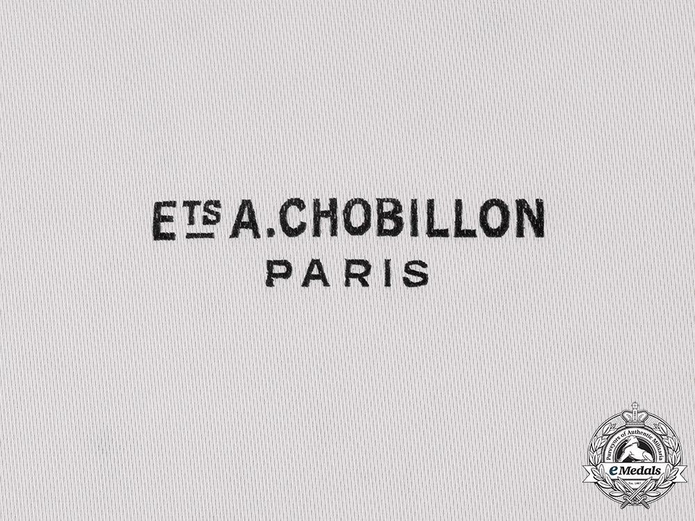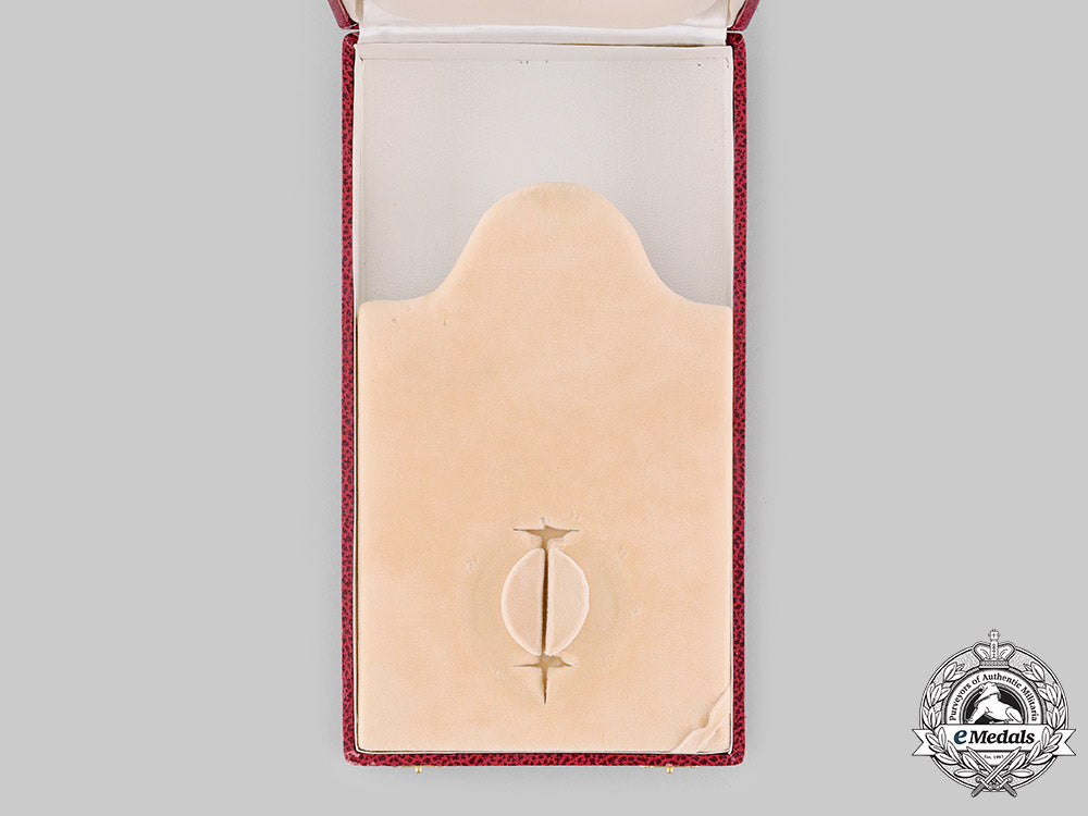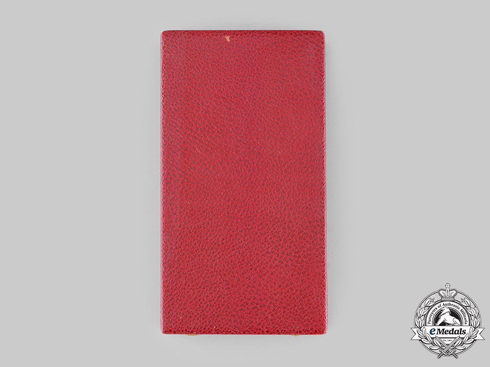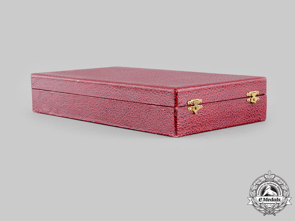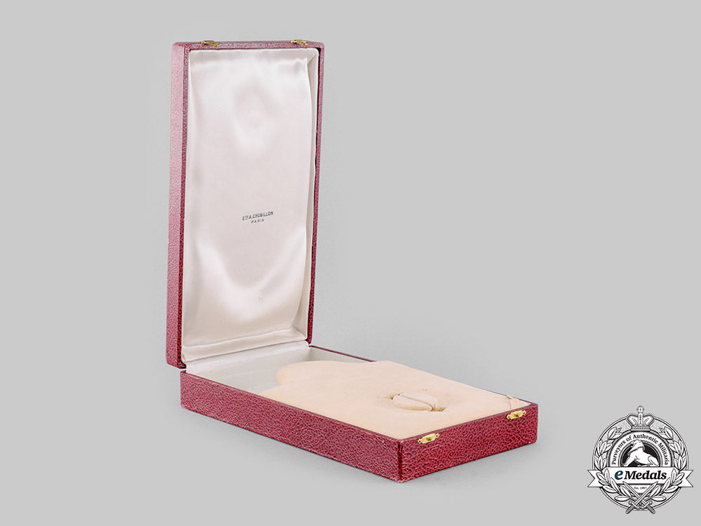 Instituted in 1879. Hardshelled design on both the lid and base, wooden frame with a cherry red simulated leather-look exterior on all sides, inside lid lined in white satin, padded and maker marked "Ets A. CHOBILLON PARIS", a white fabric-wrapped cardboard insert placed within the base and housing a raised platform in yellowish-white felt, the platform tabbed at the top for the Badge and slotted for the Breast Star, with a strap at the lower right for the Rosette, the platform affixed to the case via a single pin near the front on both sides, allowing the platform to flip up unimpeded, dual-hinged, two clasp closure, measuring 169 mm (w) x 314 mm (h) x 57.5 mm (d), very light wear and scuffing evident on the exterior, the inside particularly clean and without interruptions in the fabrics, near extremely fine.