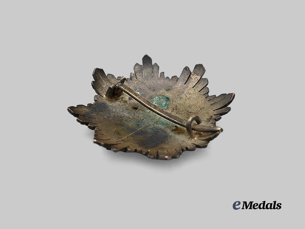 Constructed of a silver alloy with multi-coloured enamels, the obverse consisting of a vaulted eight-pointed pebbled star, overlaid by a gilded cross with its arms joined together through the quadrants by a circular laurel leaf wreath and with crossed swords piercing the centrepiece, overlaid by a central enameled medallion bearing the coat of arms of Castile and León, within a blue enameled ring bearing a gilt inscription of “AL MERITO EN CAMPAÑA”, the reverse with two visible rivets securing the obverse features in place, with a raised barrel hinge and flattened pinback meeting a round wire catch, unmarked but demonstrating the characteristics of early manufacture (c. 1936), measuring 58.86 mm (w) x 56.98 mm (h), weighing 39.4 grams, demonstrating some flecking and surface chipping to the enamels, a scarce example of one of the earliest awards issued to Condor Legion personnel, in near extremely fine condition.