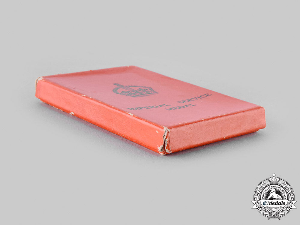(CHARLES THOMAS COWELL). Naming is engraved in small capitals. Dark patina, edge nicks, contact marks, original ribbon, better than very fine. In its cardboard box of issue, marked with the Tudor crown and inscribed "IMPERIAL SERVICE MEDAL" on the lid, extra ribbon enclosed in the box, scuffing and edge wear on the exterior, box very fine. Accompanied by a printout of the London Gazette documenting his award of the medal, along with a small newspaper article.