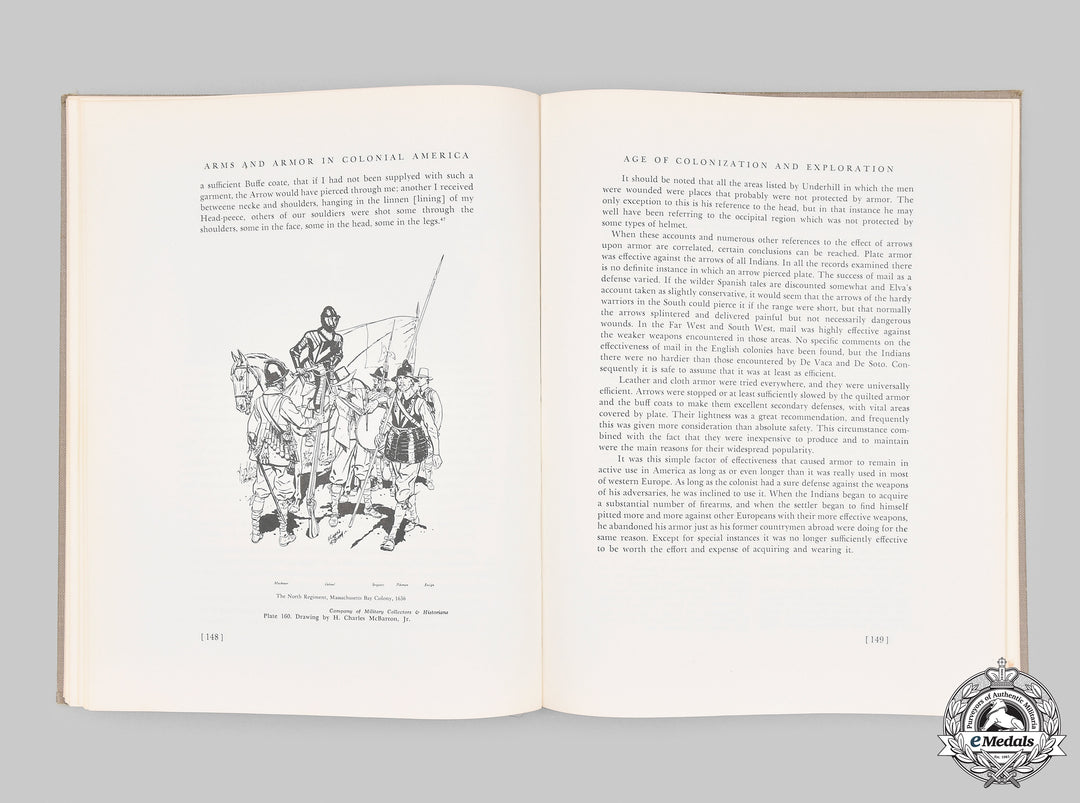 Hardcover, grayish-brown cloth cover, entitled "Arms and Armor in Colonial America 1526-1783" by Harold L. Peterson, copyrighted by the author in 1956, published by Bramhall House of New York, a division of Clarkson N. Potter, Inc. by arrangement with The Stackpole Company, Library of Congress Catalog Card Number 56-11273. The book features detailed descriptions and is fully illustrated through the use of multiple photographs, line drawings and woodcut prints. It begins with a Preface, followed by a Table of Contents. The book is divided into two books, each with its own Introduction. Book I - The Age of Colonization and Exploration 1526-1688, with four chapters: 1 - Firearms; 2 - Ammunition and Equipment; 3 - Edged Weapons; ; 4 - Armor; dealing with all the colonies that later became part of the continental United States. Book II - The French Wars and the Revolution 1689-1783, with four chapters: 5 - Firearms; 6 - Ammunition and Equipment; 7 - Edged Weapons; 8 - Armor; concerning itself primarily with the English colonies along the Atlantic Seaboard and secondarily with the French, but not the Spanish colonies in Florida and the South West, as information was lacking. It concludes with an Appendix ("The Compleat Souldier"), a Bibliography and a four page Index. The book contains 366 pages, printed in black ink, on a smooth-finished white paper stock, measuring 220 mm (w) x 285 mm (h) x 25 mm (d). It exhibits spotting and light soiling on the cover and the sides of the pages, along with some weakness evident in the spine, one tear present on pages 137-138, in addition to missing its original dust jacket, the contents of the book unaffected. Fine.