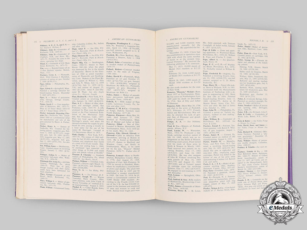 Hardcover, bluish-gray cloth cover, with dust jacket, the graphics on the front cover in red ink, the text on the spine in gold-coloured ink, entitled "Small Arms Makers - A Directory of Fabricators of Firearms, Edged Weapons, Crossbows and Pole Arms", by Colonel Robert E. Gardner, copyrighted in 1963 by the author, published by Crown Publishers, Inc. of New York, printed in the United States, Library of Congress Catalog Card Number 62-20058. As noted on the dust jacket: "This comprehensive encyclopedia is an invaluable aid to the collector of antique arms. It lists the names, locations, dates, and products of over 13,000 fabricators of small weapons: firearms, edged weapons, crossbows, and polearms. European marks (American makers did not use marks) are illustrated and identified. Colonel E. Gardner has been collecting small arms for over forty-two years and, at the same time, studying the history of their makers and identifying marks they may have used. His own collection, an extensive one, includes a small cannon made for the Duke of Flanders in 1570, some helmets beaten by hand out of a ball of metal, from the same year, and an 1803 Spanish pistol. Colonel Gardner is the author of "Arms Fabricators, American Arms and Arms Makers", and "Five Centuries of Gunsmiths, Swordsmiths and Armourers from 1400 to 1900". It begins with a Table of Contents, followed by a single page Foreword by the author. The book is divided into four Parts: I - American Gunmarkers; II - American Bladesmiths and Polearms Makers; III - Foreign Gunmakers; IV - Foreigh Fabricators of Edged Weapons, Polearms, Crossbows, and Projectiles. It concludes with a four page Bibliography. The book contains 384 pages of text only, printed in black ink, on a thick off-white paper stock, measuring 215 mm (w) x 285 mm (h) x 40 mm (d). It exhibits foxing on the edges of the pages, one small spot on the front cover, along with edge wear, tearing and repair on the dust jacket, however, the pages within remain unaffected. Better than very fine.