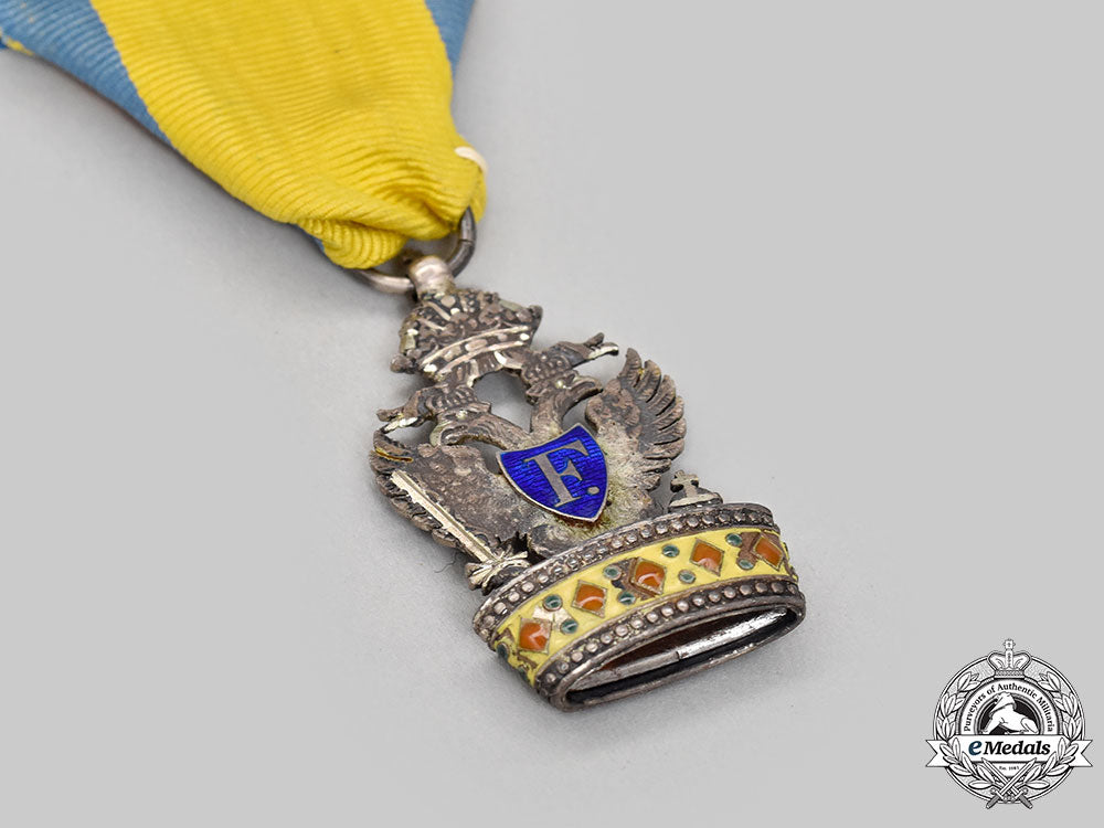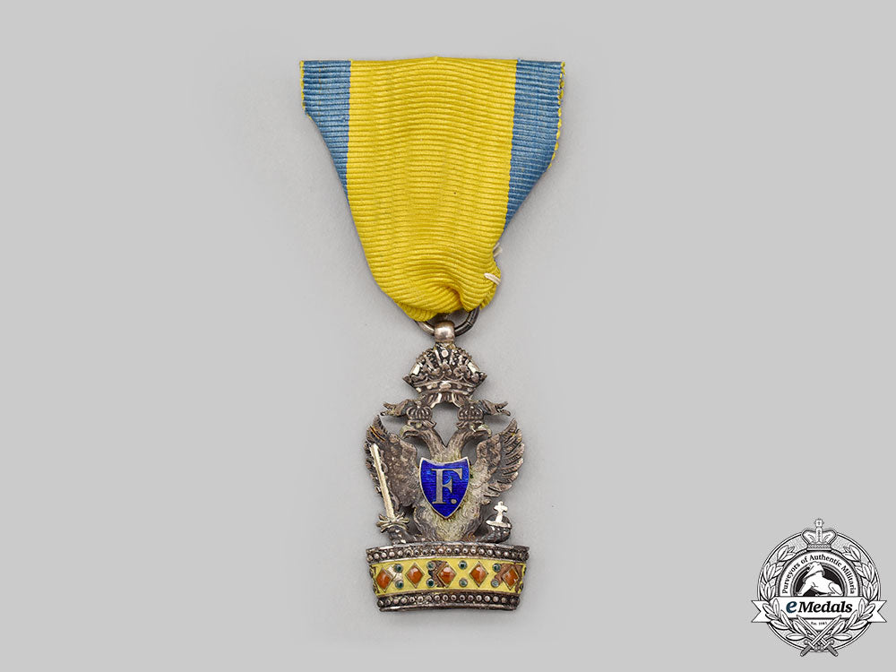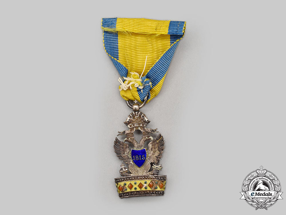(Orden der Eisernen Krone). Instituted on 7 April 1815 by Emperor Franz I. Type I (1816-1838). In silver, an early decoration presenting a double headed eagle sharing a single large crown with a sword and orb clutched in the talons, above a yellow, red and green enamelled Lombardy crown, with an internal iron ring, the obverse presents a blue enamelled shield inscribed F., the reverse shield bears the year 1815, measures 24.4mm (w) x 46.2mm (h), weighs 12.5 grams (including ribbon), worn on a correct replacement ribbon sewn around the ring, light enamel wear to crown, dark patina on silver, a very early and scarce decoration, in near extremely fine condition.