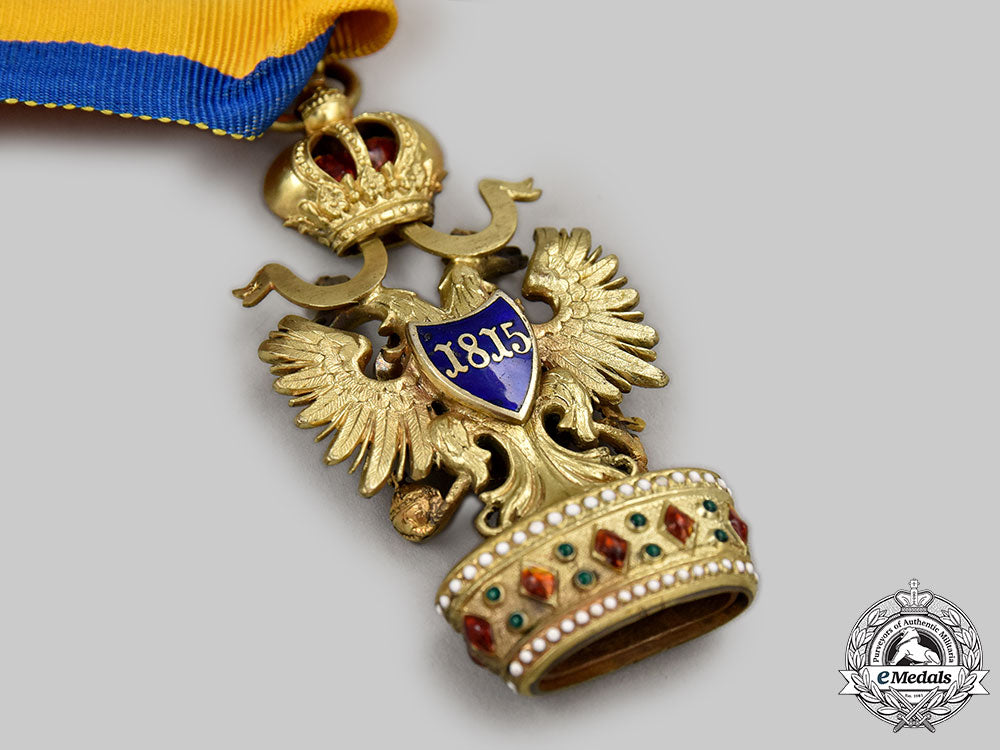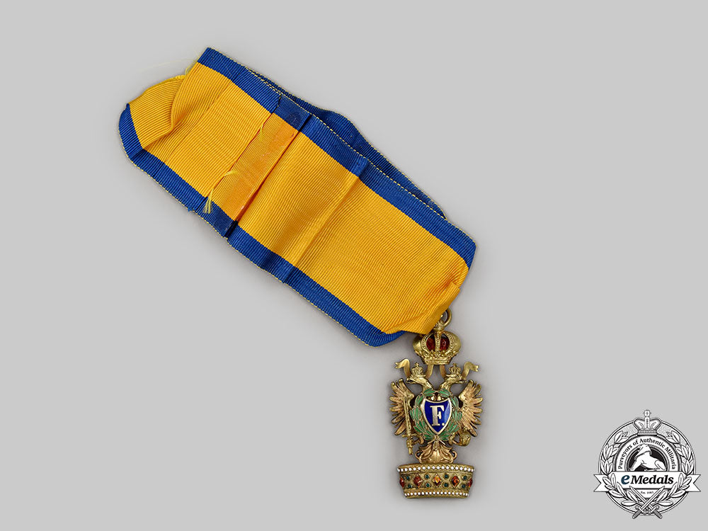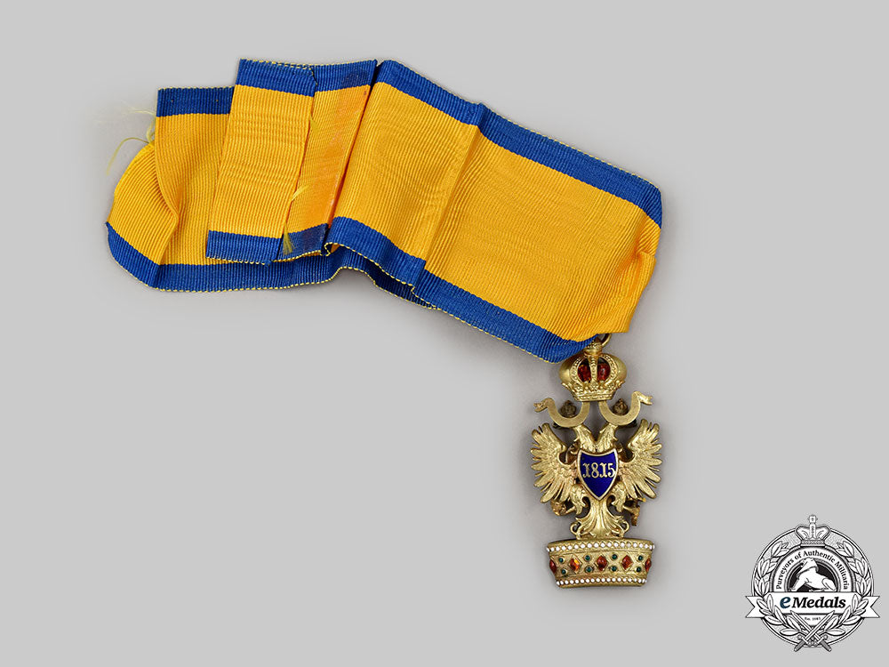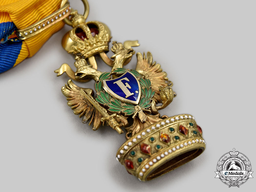 (Orden der Eisernen Krone 2. Klasse). Instituted on 7 April 1815 by Emperor Franz I. Type 3. (1914-1918 Issue). A Wartime II Class Order of the Iron Crown, c.1918, constructed of gilded bronze, consists of the Lombard Iron Crown presenting green, red and white-enamelled jewels, on which rests the two-headed Austrian eagle with sword and orb, with a blue enamelled central shield showing on the obverse the imperial initial F and on the reverse the year 1815, above rests the imperial crown firmly attached to the double-headed eagle, presenting star hallmark indicating gilded bronze, measuring 32.37 mm (w) x 63.46 mm (h - inclusive of crown), weighs 30.1 grams (including ribbon), suspended from a hollow swivel crown suspension from a horizontally pierced ball and flat suspension loop, presenting a later & privately added III Class war decoration likely by Rothe (c. 1960) constructed of green-enamel in the shape of a laurel wreath, with mid 20th century neck ribbon, and in fine condition.