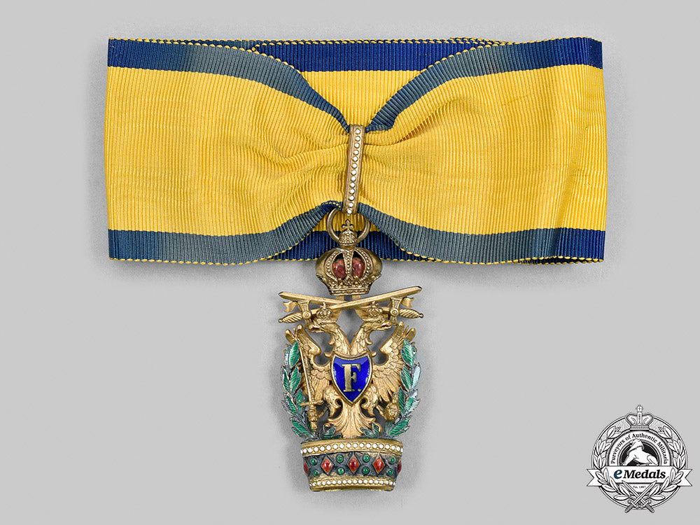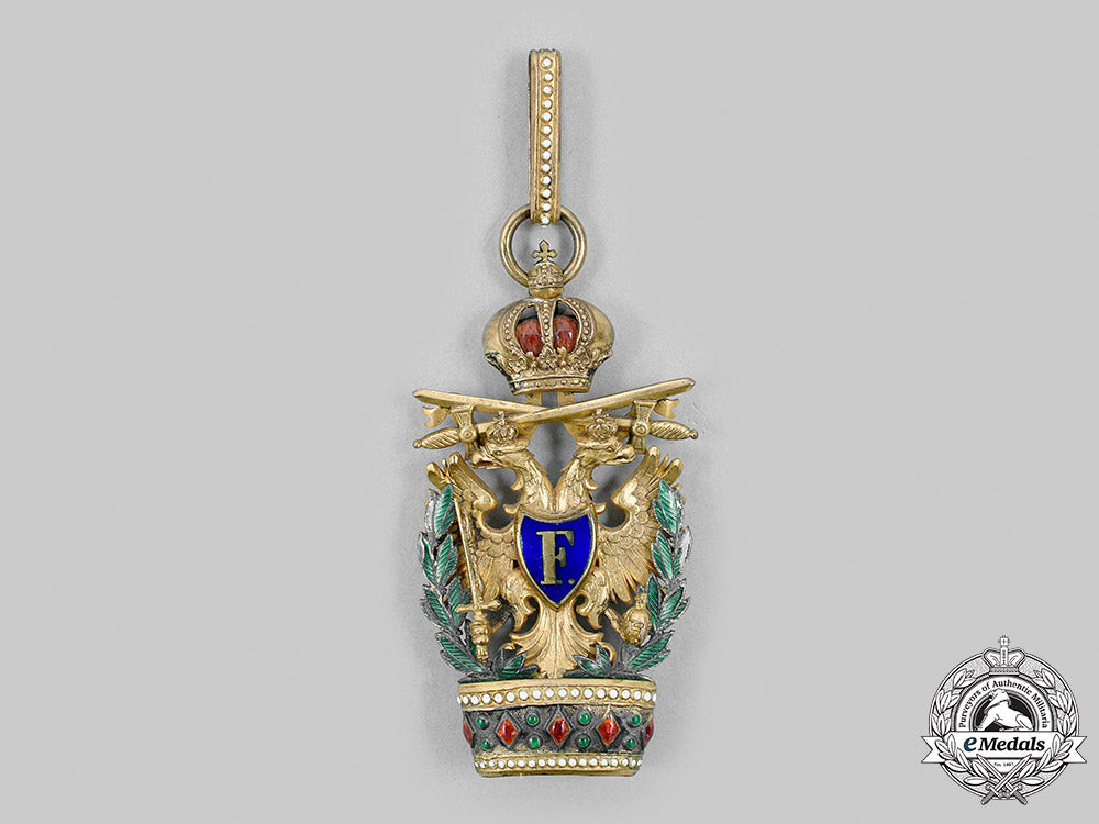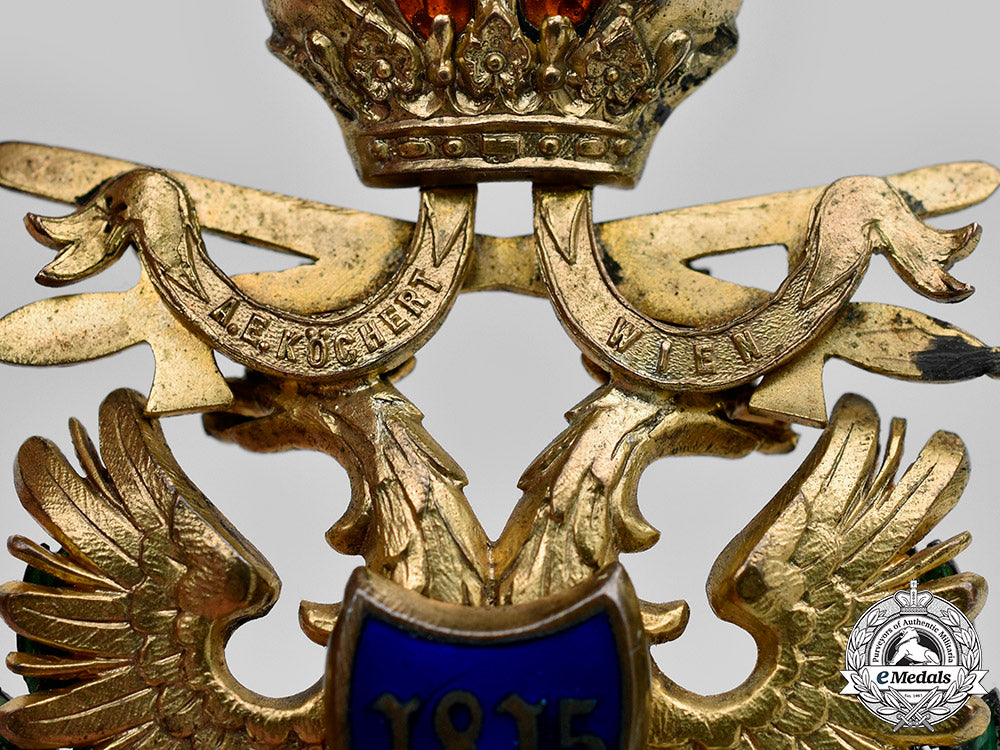 (Kaiserlicher Orden der Eisernen Krone). Reinstituted in 1815 by Emperor Franz I. Military Division. Type III (1860-1918). A II Class Order of the Iron Crown constructed of bronze gilt, consisting of a Lombard Iron Crown presenting green, red and white-enamelled jewels, which rests on the two-headed Austrian eagle with sword and orb, with a blue enamelled central shield showing on the obverse the imperial initial F and on the reverse the year 1815, surrounded by a 1920s addition green enamelled war decoration, above which resets crossed swords and an imperial crown with internal red enamelled cap, the reverse of the crown pendilia presents the makers mark of A.E Kochert and a star hallmark indicating bronze gilt, measures 35.78 (w) x 66.59 (h), weighs 35.6 grams (including ribbon), attached to it’s period neck ribbon by an elongated suspension loop with white enamel detailing, light gilt wear on decoration particularly around the crown, small enamel wear on the on the crown and on green war decoration, overall in very fine condition.