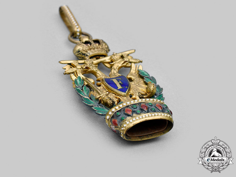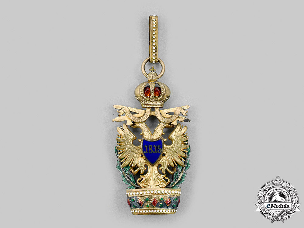 Footnote: The Order of the Iron Crown was originally established by Napoleon I on June 5, 1805, just a few days after his coronation as the King of Italy. This order was awarded for services to the crown in military, administration, arts and literature. In 1809, the insignia was altered, with the inscription in Italian and small beads were added to the points of the crown. The order was dissolved in 1814, when the “Austrian” Kingdom of Lombardy-Venetia was founded in place of the French control. The Lombardo-Venetian Kingdom joined the Austrian Empire in 1814 and was under control of the Emperor of Austria. The Napoleonic order of the Iron Crown became the Austrian ‘imperial’ dynastic order. By January 1816, the new statues were approved by Emperor Franz I, and the order was officially restored on his birthday, February 12, 1816 as the “Austrian Imperial Order of the Iron Crown.”