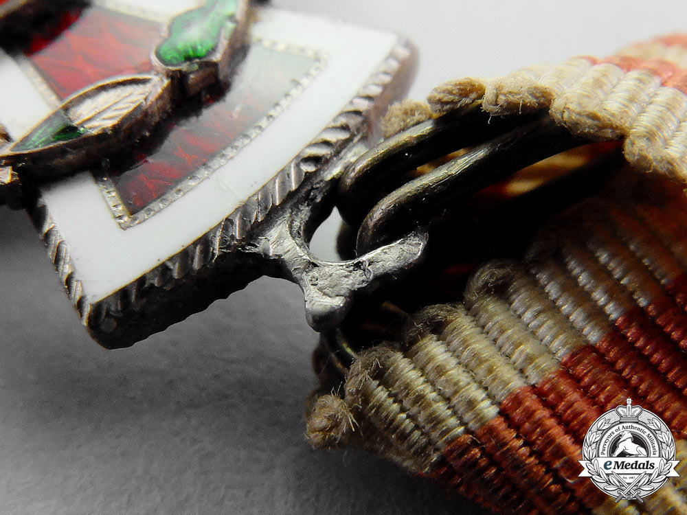 Austria; Multi-piece construction, silver with red, white and green enamels, marked with a Diana's head (Dianakopf) hallmark, the head flanked by a "2" (silver fineness) on the left and marked with the assay city mark "A" (Vienna) to the right on the obverse of the integral ring, 37 mm (w) x 45 mm (h), lightly soiled original triangular ribbon with hook and eye, chipping and loss evident in the green and red enamels on the wreath, hairline crack in the integral ring, the remaining enamels intact, good to fine.