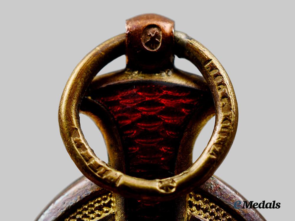 2. A Merit Cross “1849”. (Verdienstkreuz “1849”). Instituted December 12th, 1849. (Third Period: 1914-1918 issue, small type). Constructed of gilded bronze with red enamels, consisting of a Ruppert Cross with red enameled arms, the obverse with a central medallion bearing a central gilt monogram of Franz Joseph I, circumscribed by an inscription of “Viribus Unitis” (United Forces) in capitalized Latin, the reverse with a central medallion bearing the institution year of “1849” on an affixed loop and swivel ring for suspension from its period original tri-fold ribbon, the ring marked “Wilh. Kunz, Wien”, measuring 29.9 mm in diameter.
