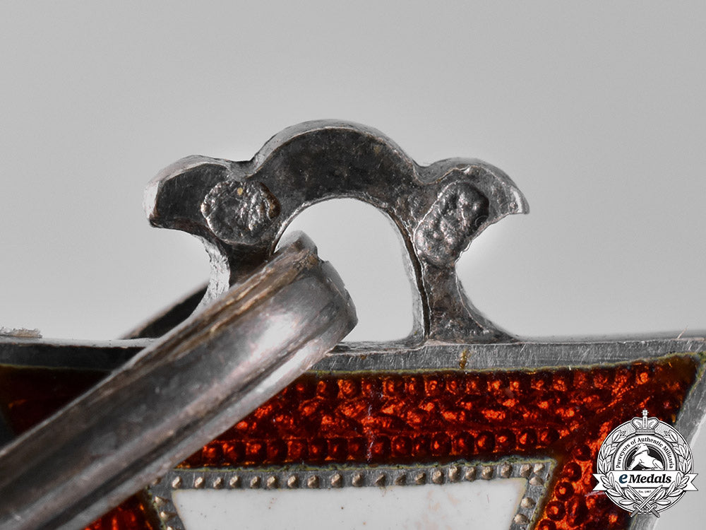 (Militärverdienstkreuz, II. Klasse, mit Schwertern, und Kriegsdekoration). A silver cross pattee with red and white enameled arms, with a green enameled laurel wreath and short silver swords between the arms of the cross; the obverse with a central white enameled medallion inscribed “VERDIENST” (German - Merit); the reverse fully enameled in white; on a double loop for suspension - marked “VM” and with a Diana’s head silver mark, as well a Vienna silver Assay mark; accompanied by a mint and unissued period original ribbon; measuring 40.89 (w) x 40.65 mm (h); weighing 34.5 grams; in overall better than extremely fine condition.