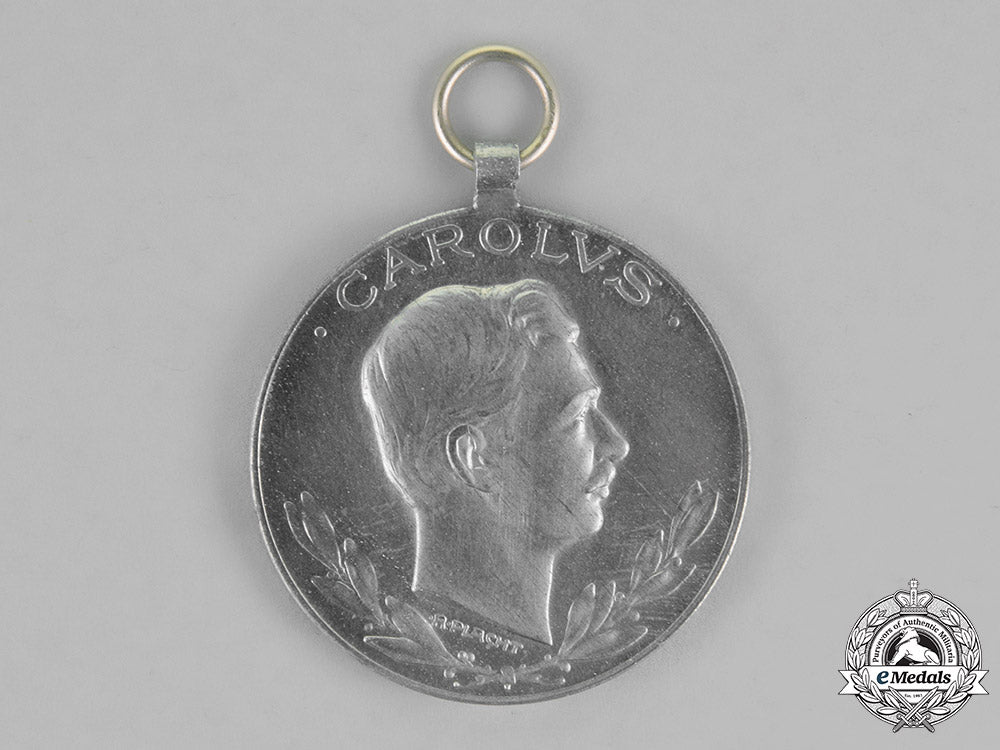 (Verwundetenmedaille). A round aluminum alloy medal; the obverse depicting a rightward facing bust of Charles I, surrounded by his name in Latin, the reverse inscribed “Laeso Militi” (Latin - The Wounded Soldier), and dated “1918”; on a loop for suspension from its period original ribbon, featuring three stripes for three times wounded; measuring 37.94 mm in diameter; weighing 18.8 grams; in overall very fine condition.