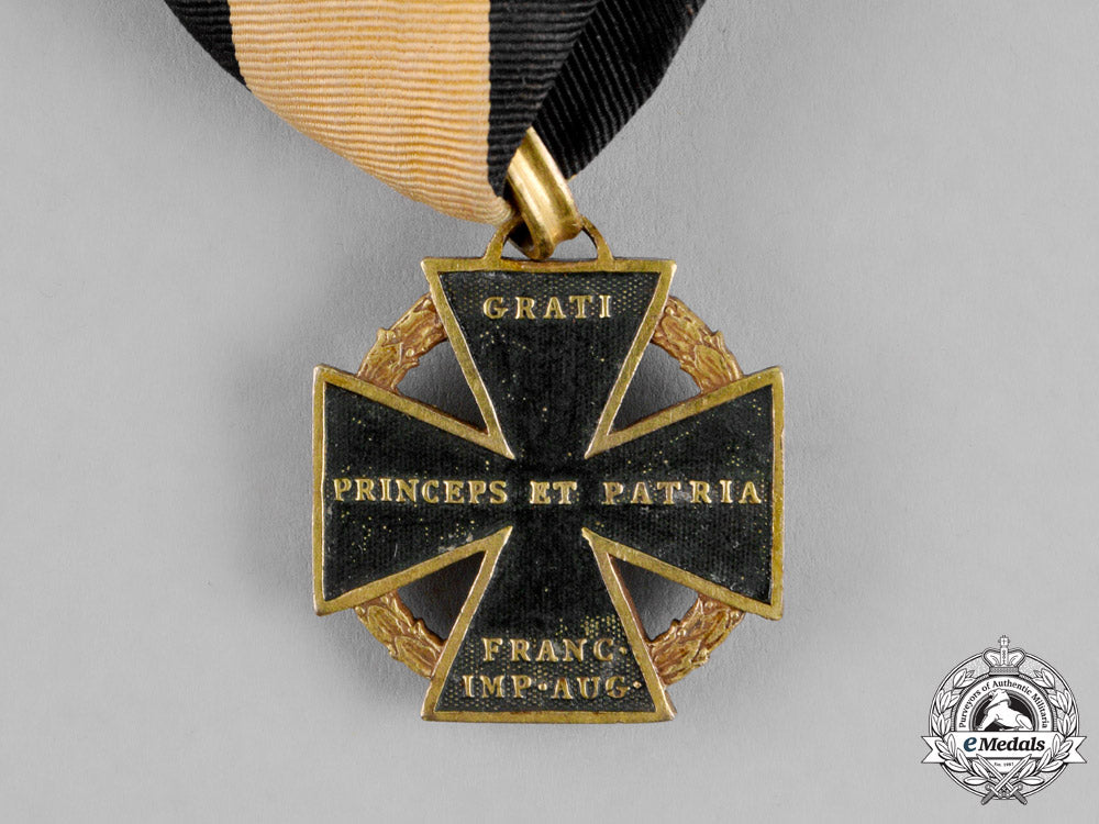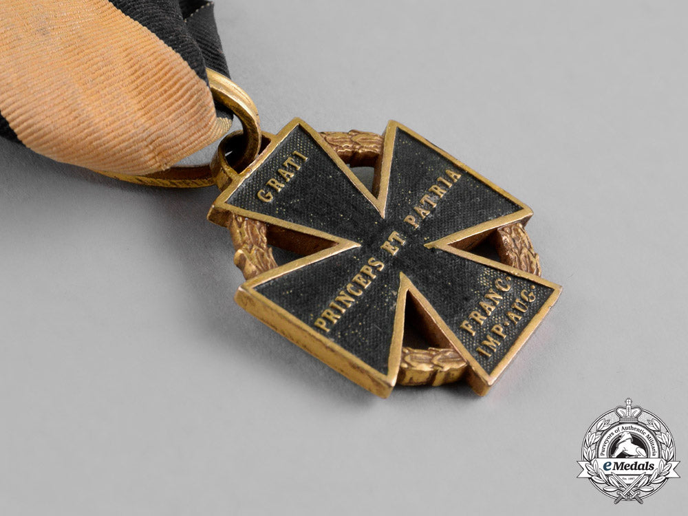 1813-1814 Issue. (Armee-Kanonenkreuz). A gilt bronze cross pattee with a blackened core and a laurel wreath between the arms of the cross; the obverse inscribed “Grati Princps et Patria Franc Imp. Aug.” in Latin script; the reverse inscribed “Europae Libertate Asserta” and dated “MDCCCXIII-MDCCCXIV”; on a broad loop for suspension from its original ribbon - the ribbon is labeled with the recipient’s name - “Franz Mumb von Mühlheim” in black ink; measuring 27.61 mm (w) x 27.31 mm (h); light contact marks from age and wear, with some loss to the original blackened finish; in overall extremely fine condition.