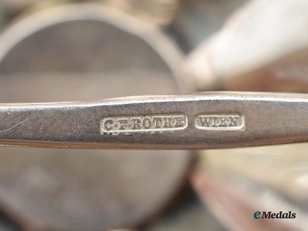Institution Date: January 8, 1808. Grand Cross with war decoration, in gilded bronze with red, white and green enamel, center medallion affixed with the monogram of Emperor Franz I encircled with Latin “Integritati Et Merito” (translation: Integrity and Merit), with reverse center medallion inscribed “Opes Regum Code Subdito Rum” (translation: The hearts of his subjects are a King’s riches), with two silver swords piercing the centerpiece the twelve o’clock arm with an integral loop connecting to a hollow gilt crown suspension, flanked by green enameled laurel branches, measuring at 41.1mm (w) x 81.5mm (h- inclusive of suspension) and weighing 18.4 grams. Accompanied by the Breast Star of the order in silver and silver gilt with enamels, center medallion affixed with the monogram of Emperor Franz I encircled with Latin “Integritati Et Merito” (translation: Integrity and Merit), with two swords piercing the centerpiece, marked “C.F. Rothe, Wein”, measuring 77.6mm (w) x 77.2mm (h) and weighing 86.0 grams, with a vertical pinback, both in presentation case and in extremely fine condition.