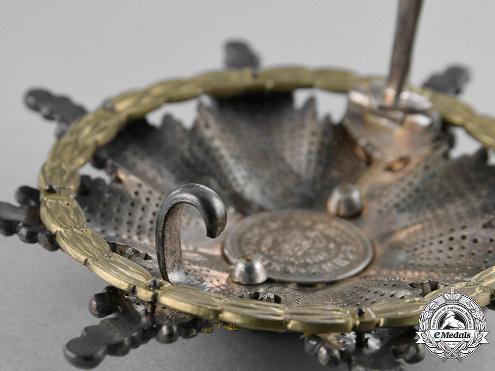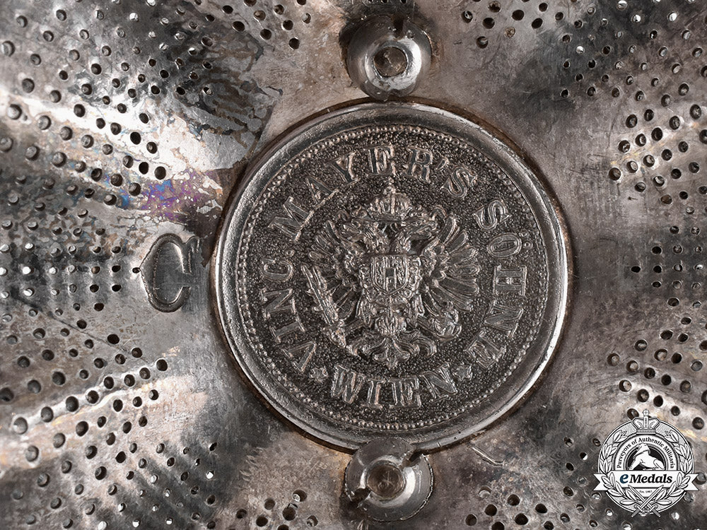 (Kaiserlich-Österreichischer Franz-Joseph-Orden, Komtur Brustkreuz mit Kriegsdekoration). Instituted in 1901 by Kaiser Franz Joseph. (Issued 1901-1918). An eight-pointed silver faceted star, the obverse with a bronze gilt cross with red enameled arms, and with double headed crowned eagle in gilt bronze, with a central white enameled medallion inscribed “FJ” in gilt, along with chains and “Viribus Unitis” (Latin - United Strength) inscribed in gilt, topped with a partially enameled gilt crown fastened to the twelve o’clock arm; the reverse featuring silver gilt laurel wreath fastened to the cross via seven rivets, with two rivets visible where the badge is attached to the star, marked “Vincent Mayer’s Söhne, Wien” and “C” for “Commander”, measuring 80.05 mm (w) x 79.71 mm (h), weighing 69.2 grams, in overall better than extremely fine condition.