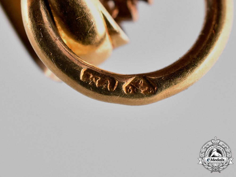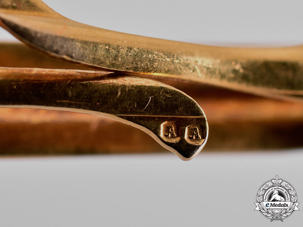 (Franz Joseph Orden, Komturkreuz). Instituted on 2 December 1849 by Franz Joseph I. Type 1. (Issued 1849-1914). An excellent quality 18K Gold cross with red-enamelled arms, with the imperial double-headed eagle, partially enameled in black, shown in the angles of the cross, the two heads of the eagle bear in their beaks a loop of chain with the emperor’s motto “VIRIBUS UNITIS” (“WITH UNITED FORCES”) applied at the lower edge, the white-enamelled central medallion shows the letters “FJ” for Franz Joseph, surmounted by the Austrian imperial crown, reverse presents a white-enamelled central medallion bearing the date “1849,” maker mark “VM” for Vincent Mayer’s Söhne of Vienna, gold hallmark of a goat’s head between the number “3” and letter “A” denoting Vienna between 1872 and 1922, measuring 37.12 mm (w) x 69.42 mm (h - inclusive of crown), weighing 22.2 grams, date on reverse central medallion is loose and missing enamels, on flat suspension loop, hallmarked with “A” initials, from period original red neck ribbon, and in overall extremely fine condition.