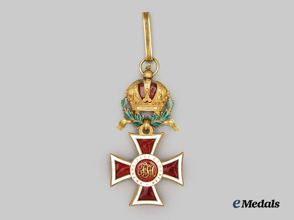 Instituted in 1808. In bronze gilt and enamels, red-enameled cross with white enamel edging, obverse centerpiece bearing the monogram FIA in gold on a red enameled background, surrounded by a white enameled ring with the motto INTEGRITATI ET MERITO, the reverse centerpiece motto reads OPES REGUM CORDA SUBDITORUM on a white enameled background, surrounded by a gold ring, inclusive of laurel and crown suspension 79.3 mm (h) x 40 mm (w), on original neck ribbon, enamels intact, extremely fine condition.