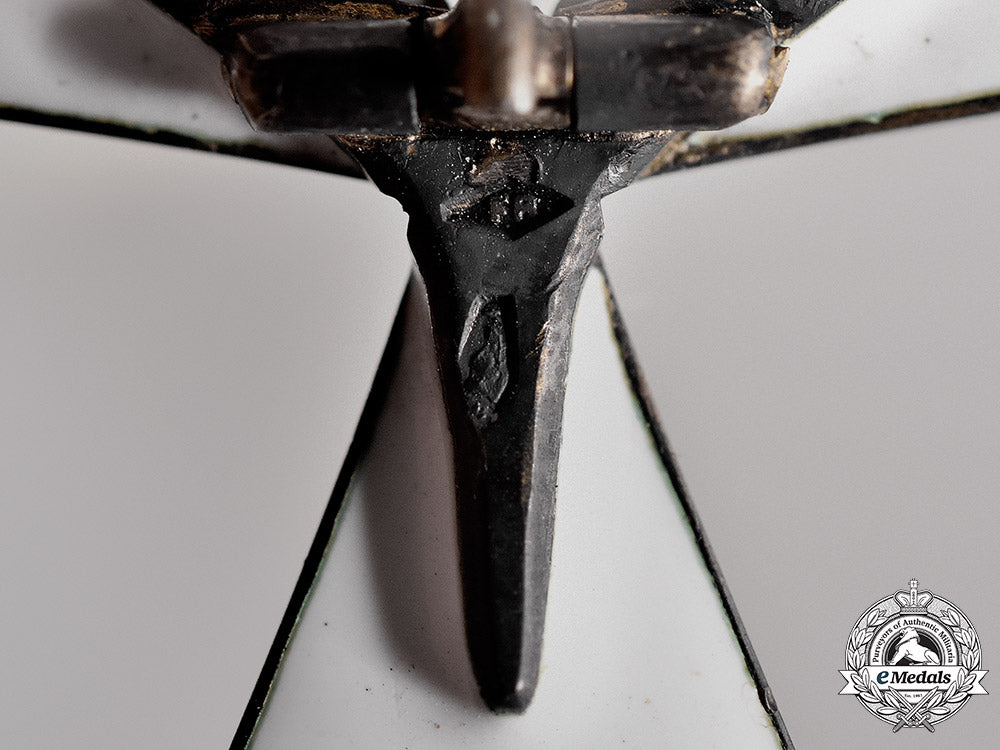 (Souveräner Malteserorden Donatus der Gerechtigkeit). Constructed of silver, with three Maltese-Cross shaped white enameled arms; vertical pinback; marked with an Austrian silver mark, and maker marked “FA” (an unknown maker) on the reverse); measuring 54.60 mm (w) x 47.70 mm (h); in overall better than extremely fine condition.