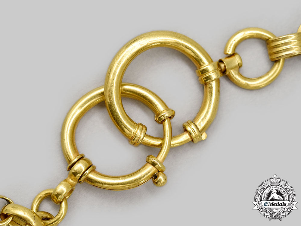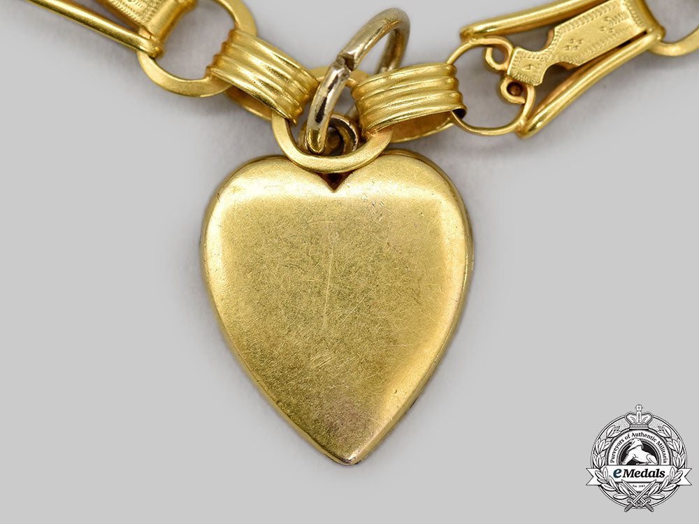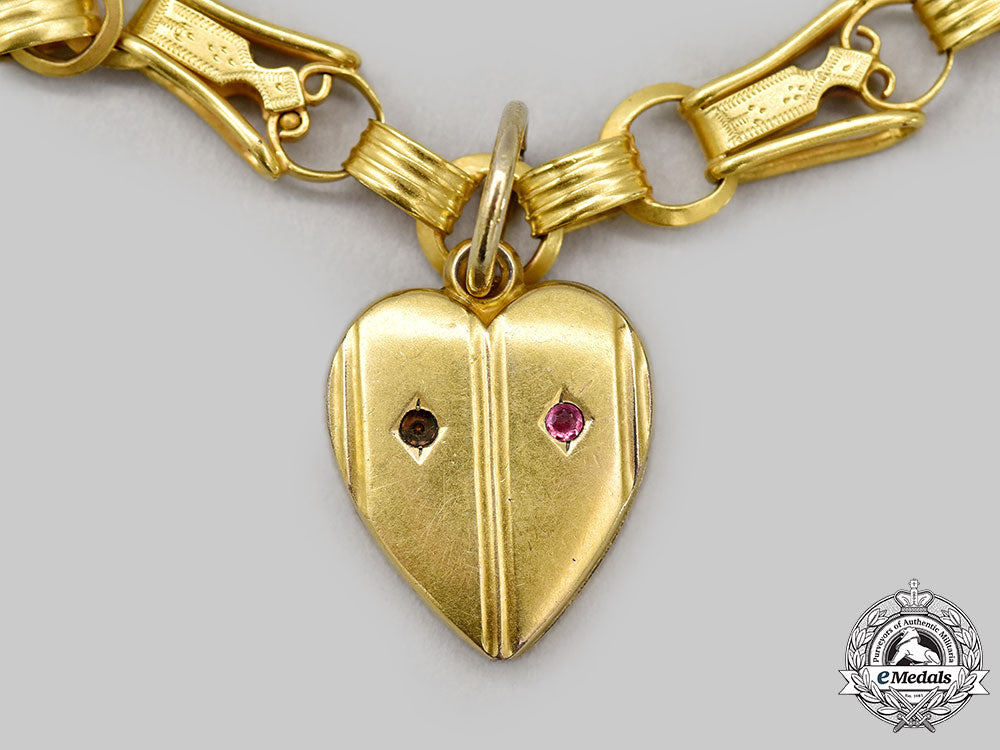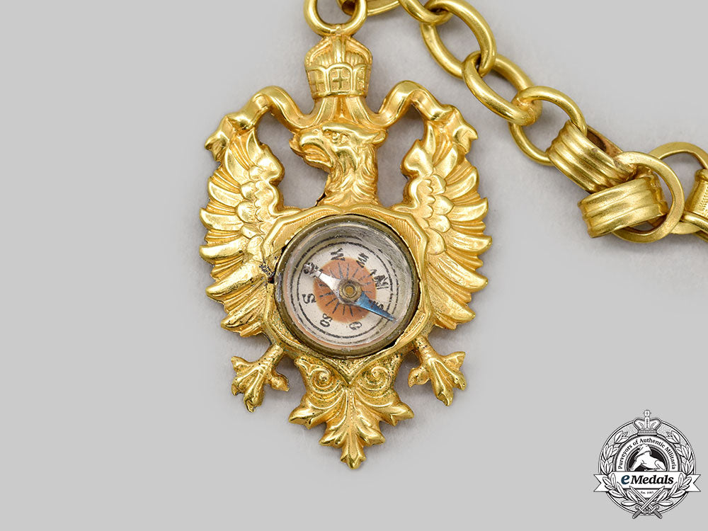 The fob composed of a 270 mm long chain with large rings at either end in bronze gilt, a 25.5 mm (w) x 43 mm (h) die-stamped bronze gilt eagle surmounted by a crown insignia attached at one end of the chain, the chest of the eagle with a 12 mm wide functioning compass embedded in it, a 18.5 mm (w) x 23.8 mm (h) heart pendant in bronze gilt affixed one-third of the way up on the chain, the pendant with one ruby red jewel on the right side of the obverse, the one on the left side having been lost to time, very fine.