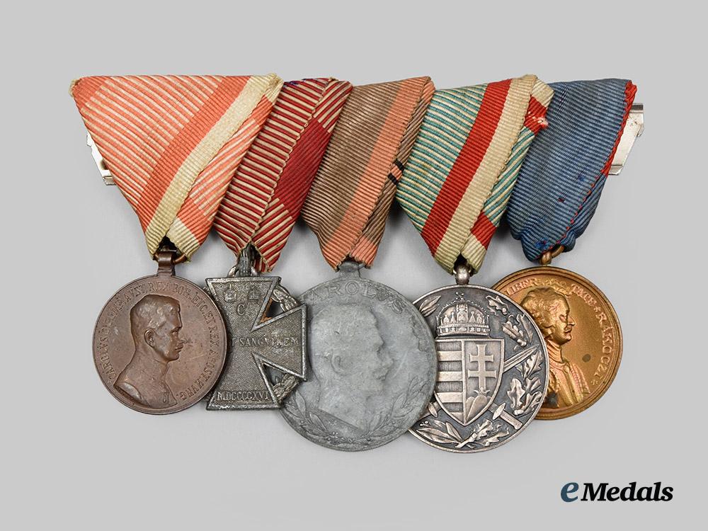 1. Mounted in Austrian-style on period triangular ribbons, featuring seven awards including: Bravery Medal, in silver with bust of Karl I (1917-1918), zinc; Bravery Medal Bronze Grade, Karl I (1917-1918), bronze; A Karl Troop Cross, zinc; Wound Medal, zinc; A Five Year Service Cross, bronze; Hungarian First War Commemorative Medal 1914-1918, silvered bronze; First World War Commemorative Medal 1914-1918, bronze gilt; with pinback, remains fine.