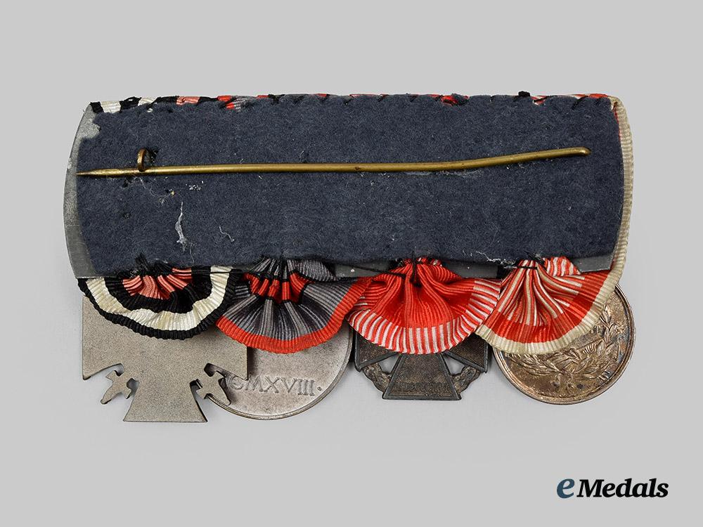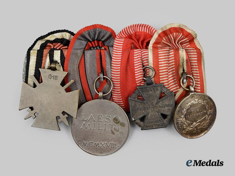2. Mounted group of four awards, on period ribbons and with pinback assembly; Bravery Medal, II Class Silver Grade, Franz Joseph I (1914-1916); A Karl Troop Cross, zinc; Wound Medal, zinc; Hindenburg Cross, Combatant issue, bronze; remains fine.