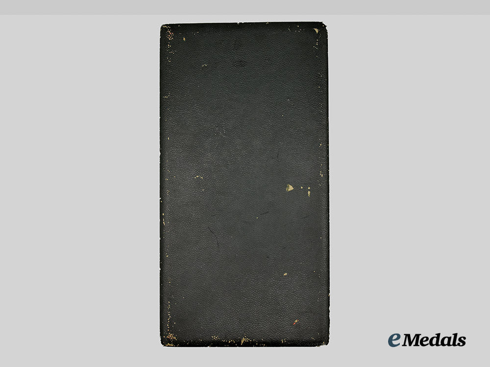 3. Accompanied by a boutonniere and a miniature of the award on a miniature full-size ribbon, as well as its case of issue, constructed of a lightweight wooden frame, with a green textured faux leather exterior, the interior of the lid lined with padded off-white silk, with a space for the placement of the ribbon on the base of the case, with a recessed medal bed for the award, with dual exterior hinges (one broken), with an intact interior fabric hinge cover, measuring 173 mm (w) x 330 mm (l), in near very fine condition.