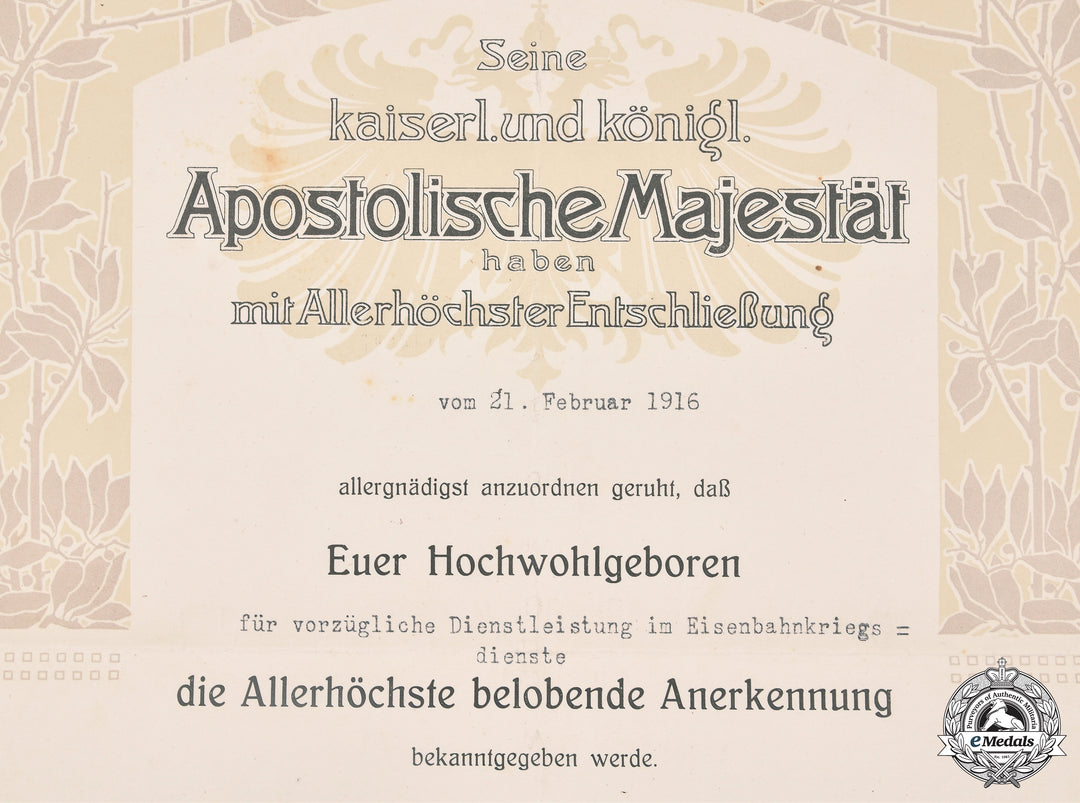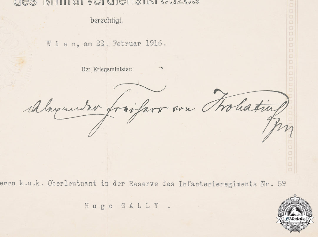 The certificate for the Bronze Military Merit Medal on the ribbon of the Military Merit Cross is made out to Oberleutnant (first lieutenant) Hugo Gally in the Reserve of Infantry Regiment No. 59. It was granted for outstanding services in the railway aspect of the war. The certificate is dated to Vienna on February 22, 1916.