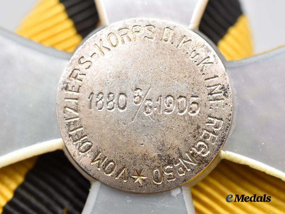 (Militärdienstabzeichen für 25 Jahre). Instituted September 19th, 1849. Type IV (1913-1918). III Class for Officers for 25 Years. A bronze gilt Cross Pattée with dimpled edges, the obverse with a double-headed single-crowned silver eagle bearing the Austro-Hungarian crest on its chest, the reverse presents a silver medallion engraved COM OFFIZIERS-KORPS D. K.u.K. INF: REG No 50. 1880 8/8 1905, the arms of the reverse bearing superimposed mother of pearl, measures 34.0 mm (w) x 38.1 mm (h), weighs 15.3 grams including ribbon, areas of gilt wear and oxidation behind silver eagle, small chips to the mother of pearl arms on the reverse, remains in very fine condition.