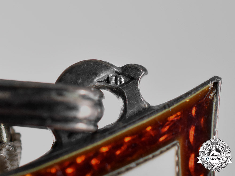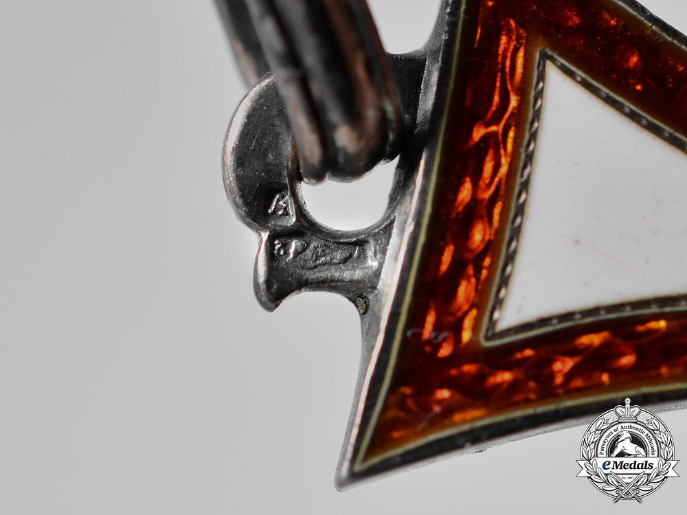 Militärverdienstkreuz. Instituted in 1849. In silver with red and white enamels, marked with an ""A"" (Vienna), a dog's head (800 silver, used between 1867 and 1922) flanked by a ""3"" (silver fineness) on the left and an ""A"" (Vienna) on the right, and maker marked ""FR"" (Rothe) on the integral ring, measuring 30.7 mm (w) x 34.5 mm (h) inclusive of its integral suspension, chipping evident in the red enamels on the arm at 3 o'clock on the obverse and in the white enamels on the arm at 6 o'clock on the reverse, on its original triangular wartime ribbon with hook and eye, better than very fine.