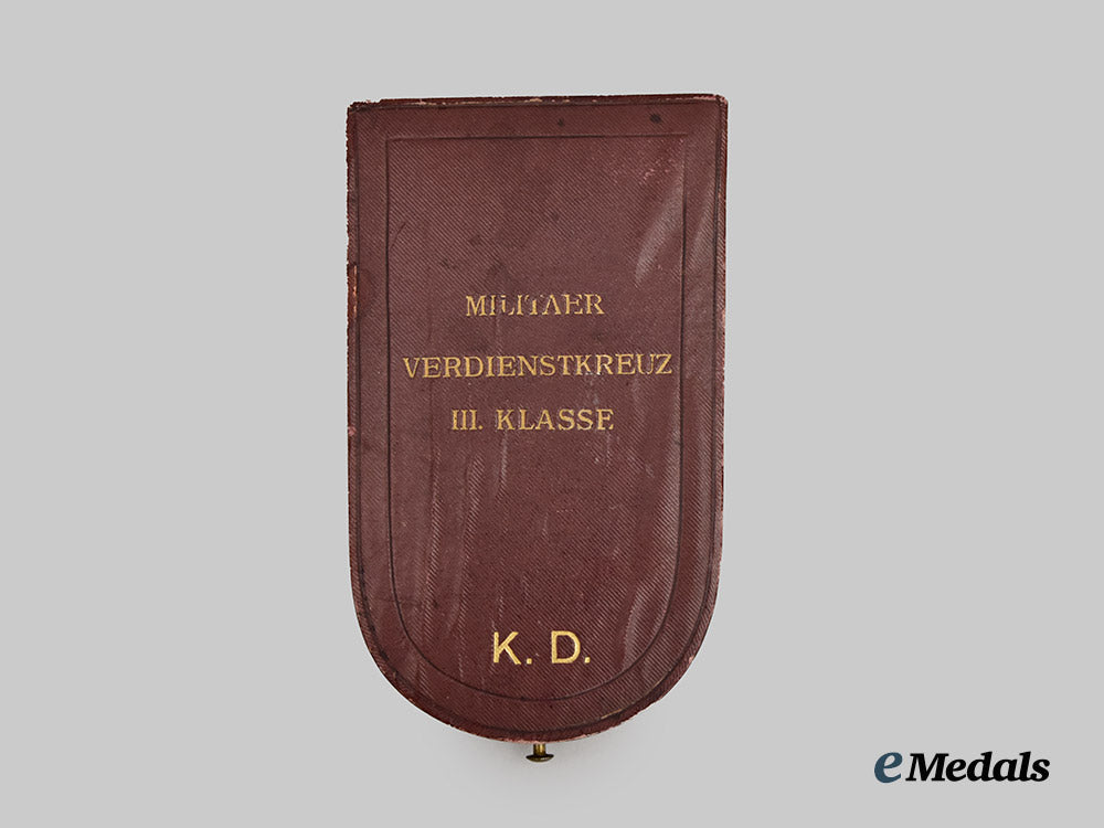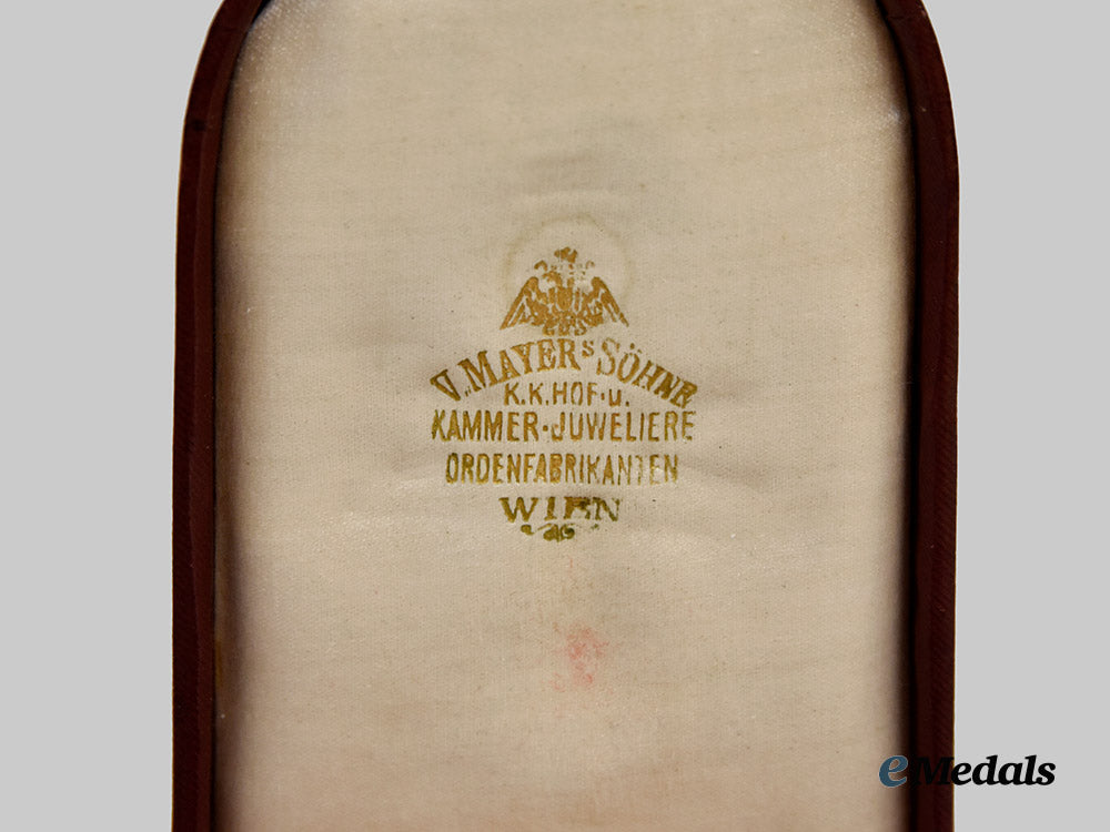 (Militärverdienstkreuz, III Klasse). Instituted October 22nd, 1849. (c. 1918 issue). Constructed of silver and silver gilt with multi-coloured enamels, on a fixed loop and swivel ring for suspension from its period original Austrian-style tri-folded ribbon featuring gilded crossed swords, consisting of a silver Cross Pattée with a silver gilt laurel wreath in the quadrants between the arms of the cross, the obverse of the cross with red and white enameled arms, with a central white enameled medallion bearing the inscription “Verdienst” (Merit) in capital lettering, surrounded by a red enameled ring, the reverse with solid white enameled arms and a white enameled center medallion, assay office marked with an "A" (Vienna) on the swivel loop, the obverse of the integral suspension maker marked with an "M" (V. Mayer's and Son of Vienna) on the right side and Austrian hallmarked with a Diana's head (Dianakopf) (which was used between 1872 and 1922) on the left, measuring 30.8 mm (w) x 34.6 mm (l), weighing 17.63 grams, the enaemels on the obverse red ring slightly chipped and with a hairline crack in the white enameled medallion on the reverse, in overall better than very fine condition. Accompanied by a ribbon bar, constructed of a zink core with the award ribbon and gilded crossed swords on the obverse, the reverse with dual downward pointing hooks for attachment to a uniform, measuring 40 mm (w) x 18 mm (l). With a matching presentation case, constructed of a lightweight wooden core, with a dark red/burgundy faux leather exterior, the exterior of the lid embossed with “Militaer-Verdienstkreuz III. Klasse” and “K.D.” in gilt capital lettering, the interior of the lid is lined with a padded off-white silk liner, embossed with the maker mark of “V. Mayer & Sons” in gilt letters, with a functional exterior metal hinge and intact interior fabric hinge cover, functional push-button closure, with a recessed medal-bed to accommodate the triangular ribbon and the award itself, measuring 65 mm (w) x 112 mm (l), in near extremely fine condition.