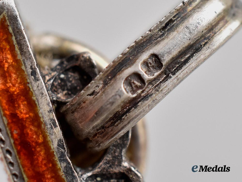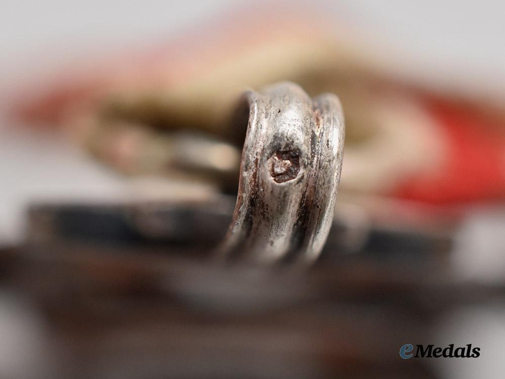 (Militärverdienstkreuz). Instituted on October 24th, 1849. Type II (1914-1918 Issue). A Military Merit Cross III Class, of multi-piece construction, in silver with red and white enamels, consisting of a Cross Pattée with red and white enamelled arms, with gilded laurel leaves in the quadrants between the arms of the cross, the obverse with a central white enamelled medallion inscribed with “VERDIENST” (Merit), the reverse with white enamelled arms and center, marked on the integral suspension ring with VM maker mark denoting manufacture by Vincent Mayer, and a dianakopf denoting .900 fineness from 1872-1922, marked A on the loop denoting Vienna manufacture, suspension from its period original tri-fold ribbon bearing crossed sword device, measures 30.3 mm (w) x 34.2 mm (h), weighs 17.7 grams including ribbon with crossed swords, very fine condition.
