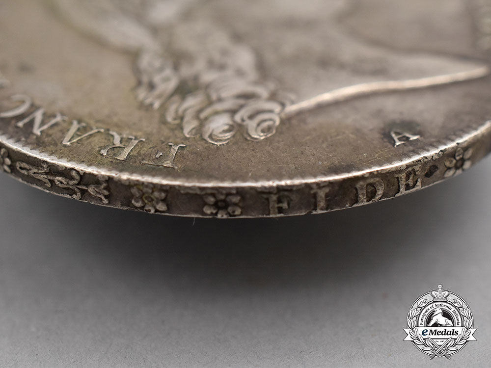 3. A 1796 Austrian Netherlands kronenthaler coin, constructed of silver, unmarked, measuring 40.15 mm in diameter, weighing 29.6 grams, in extremely fine condition.