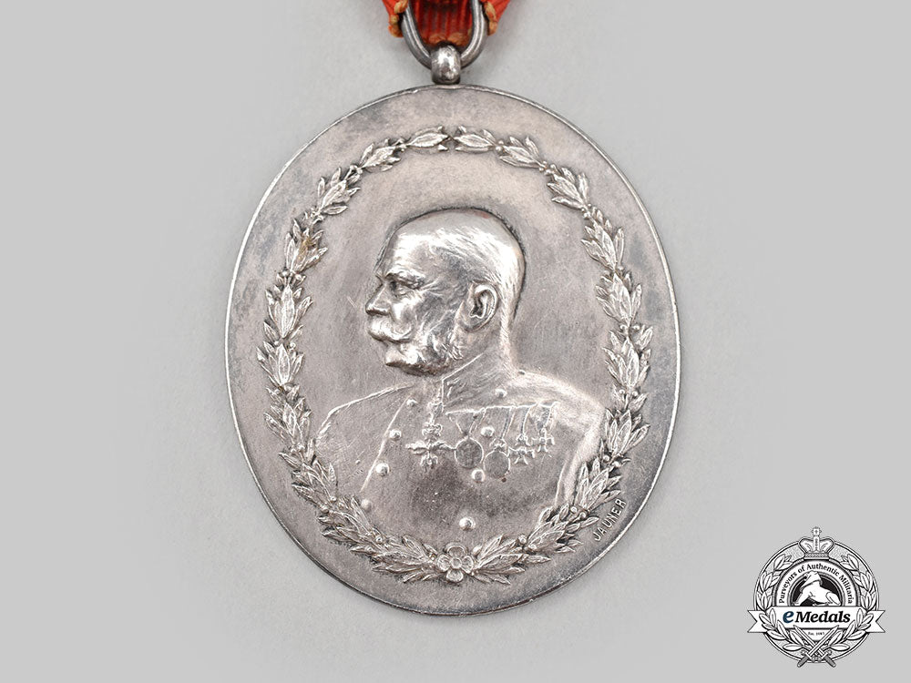 Type IV. In Silver, an ovular medal with obverse featuring the left facing bust of Franz Joseph, the reverse presents a mare and foal on grassy field, surrounded by a wreath, measures 41.7mm (w) x 53.3mm (h), weighs 36.7 grams (including ribbon), marked A on rim for Vienna Central Mint, and JAUNER on obverse at 5 o’clock, lovely patina, minor edge knocks, in extremely fine condition.