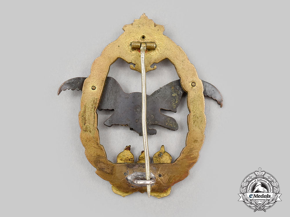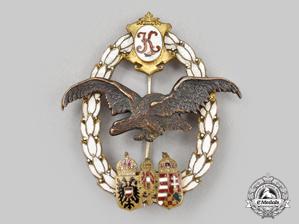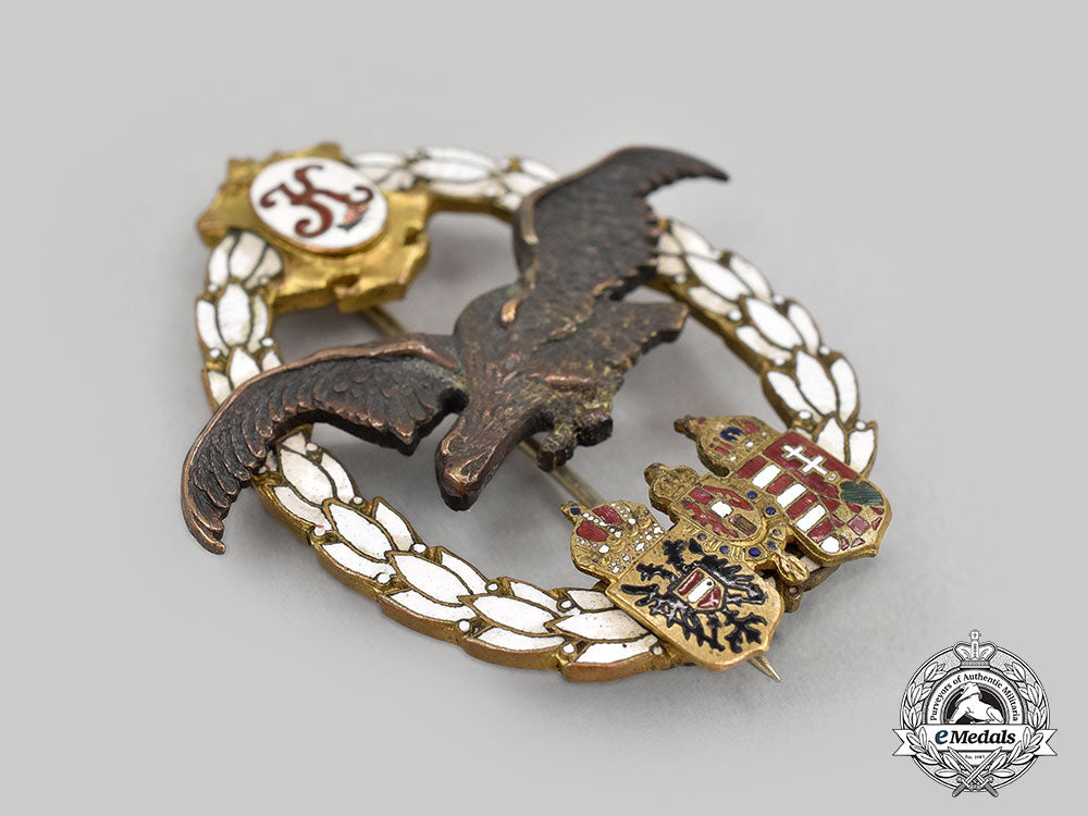 (Flugzeugführer und Beobachterabzeichen). Issued 1917-1918. A badge by a rare maker, two-piece construction, consisting of a patinated bronze eagle, fastened onto an open-ended oval shaped and white enamelled laurel wreath via two rivets visible on the reverse, towards the top of the badge is a white enamelled shield featuring the black enamelled cipher of Karl I, while the bottom of the wreath is decorated with the coat of arms of the Austro-Hungarian Empire. The reverse presents a vertical pin, hook is a later addition, reverse of eagle marked with BSW in cloverleaf denoting Gebruder Schneider Wien manufacture. The badge measures 51.3mm (w) x 57.3mm (h), weighs 26.5 grams, lightning bolts missing from eagle’s talons, enamel crazing in wreath and a large chip present in the cipher’s background, a badge by a rare maker in near very fine condition.