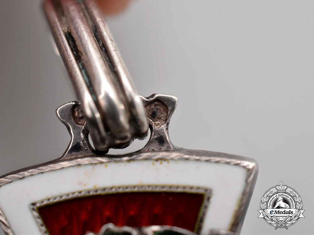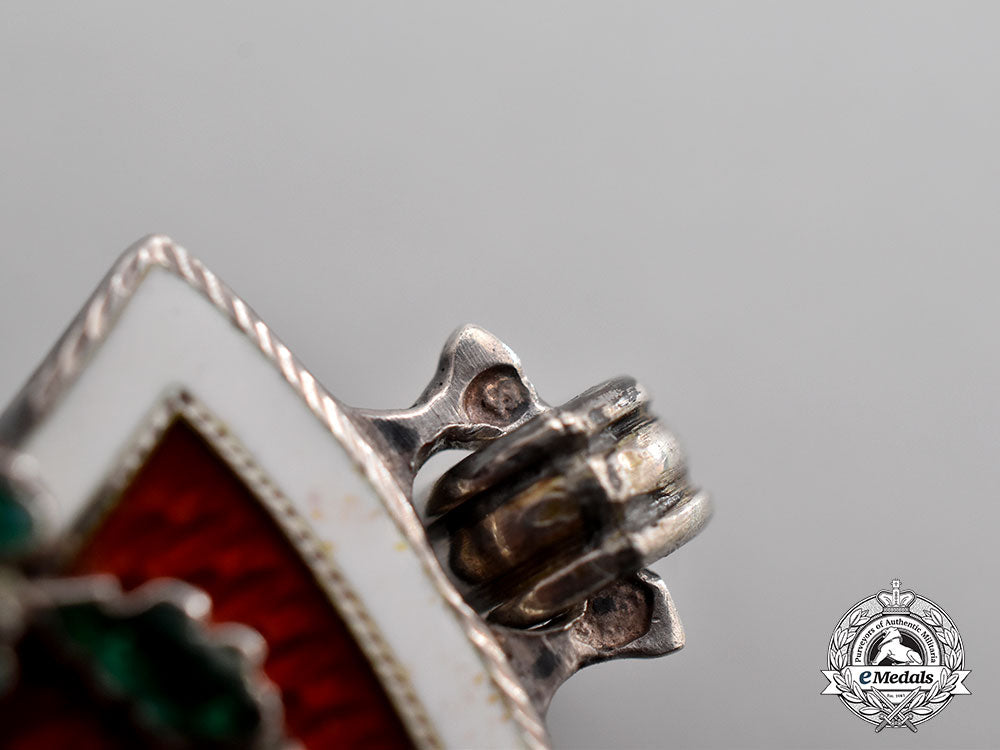 (Ehrenzeichen vom Roten Kreuz, 1. Klasse, mit Kriegsdekoration). Instituted 1914. Military Division. A Latin cross constructed of silver, with red and white enamelled arms, the obverse consisting of a central white enamelled medallion with a red enamelled red cross, surrounded by a ring of red enamels, inscribed “PATRIAE AC HUMANITATI” (Latin - For Country and Humanity) in silver gilt capital lettering, the arms of the cross enamelled with white enamels on the outer edge and red and red enamels on the interior of the arms, the reverse enamelled in the same style, with a central white enamelled medallion dated “1864-1914”), suspended from a double loop suspension, marked with the Austrian silver hallmark for “800” silver purity, as well as an illegible maker mark, measures 48.1mm (w) x 61.3mm (h), weighs 35.0 grams, loss of enamel to green oak leaf and laurel wreath, otherwise, enamels intact and remains in better than very fine condition.