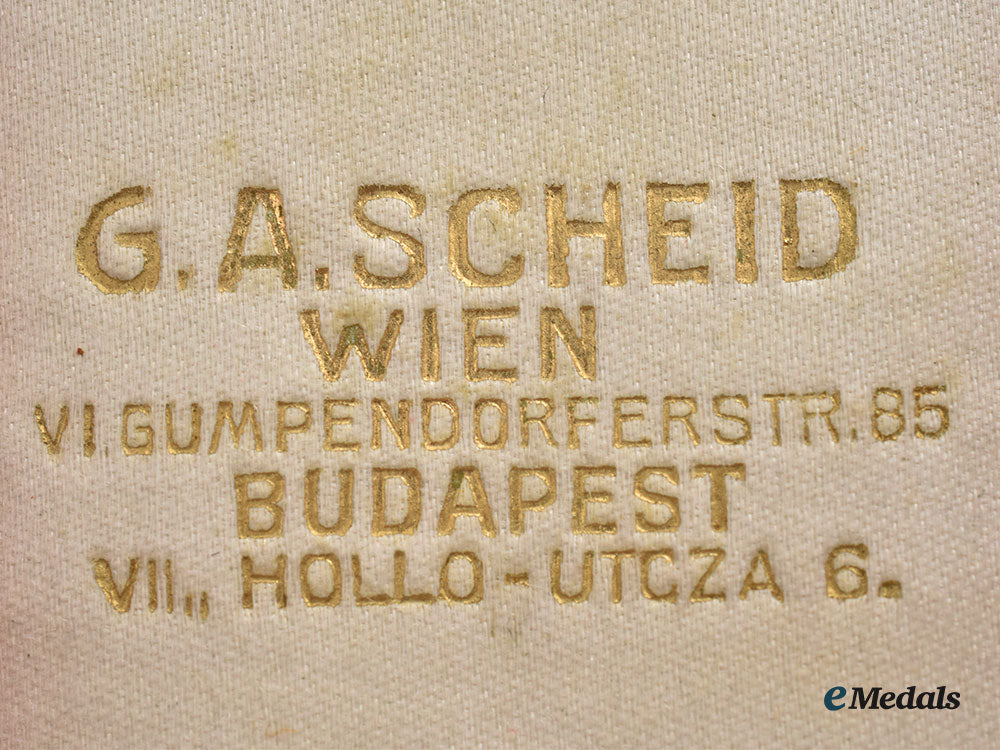 Contained in its original case of issue, red leatherette exterior marked Patriae ac Humanitati 1864-1914 K.D., the interior lid is maker marked G.A. SCHEID WIEN, a crème coloured velvet medal bed, measures 60mm (w) x 110mm (h) x 21mm (d), light wear, hinge and clasp functional, remains in very fine condition.