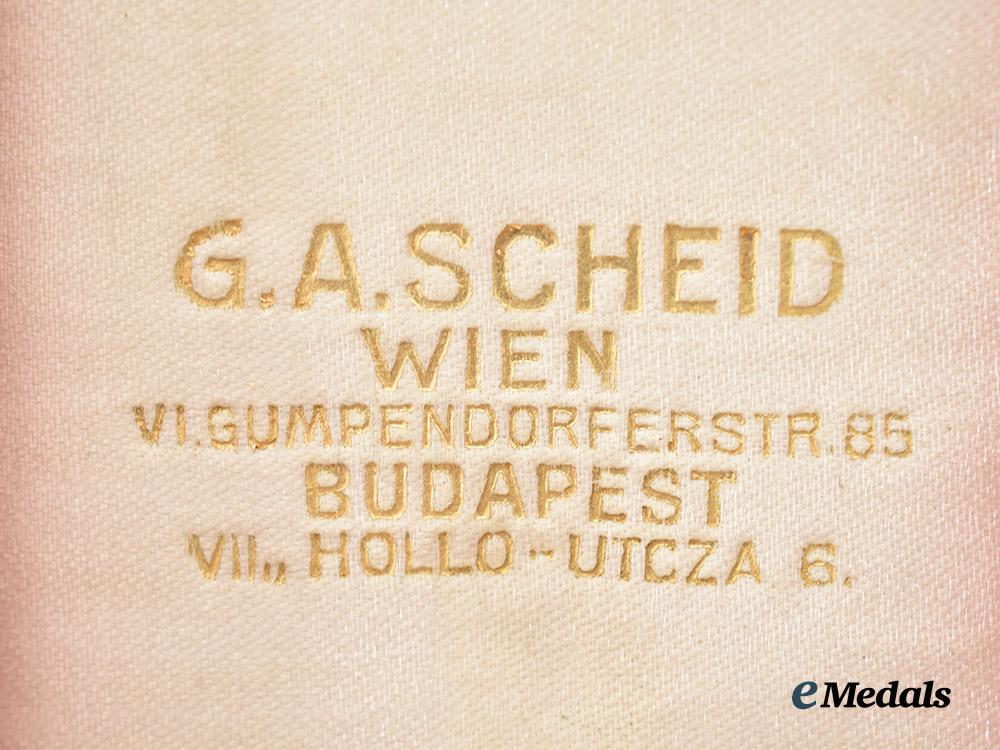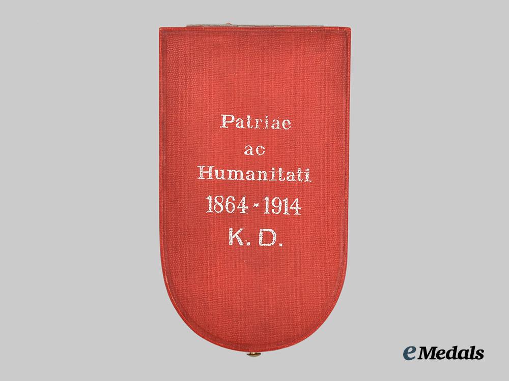 Original case, red exterior marked “Patriae ac Humanitati 1864-1914 K.D.”, interior marked G.A SCHIED, WIEN, measures 60.8 mm (w) x 110 mm (h) x 20.9 mm (d), in very fine condition.