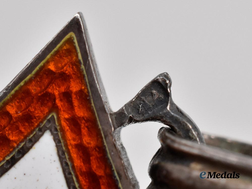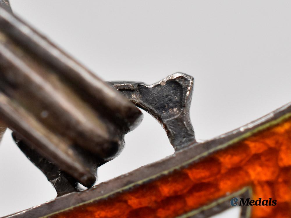 (Militärverdienstkreuz). Instituted on October 24th, 1849. Type II (1914-1918 Issue). A Military Merit Cross III Class, of multi-piece construction, in silver with red and white enamels, consisting of a Cross Pattée with red and white enamelled arms, with gilded laurel leaves in the quadrants between the arms of the cross, the obverse with a central white enamelled medallion inscribed with “VERDIENST” (Merit), the reverse with white enamelled arms and center, marked on the integral suspension ring with VM maker mark denoting manufacture by Vincent Mayer, and a dianakopf denoting .900 fineness from 1872-1922, marked A on the loop denoting Vienna manufacture, suspension from its period original tri-fold ribbon, measures 30.5 mm (w) x 34.1 mm (h), weighs 15.0 grams including ribbon, very fine condition.