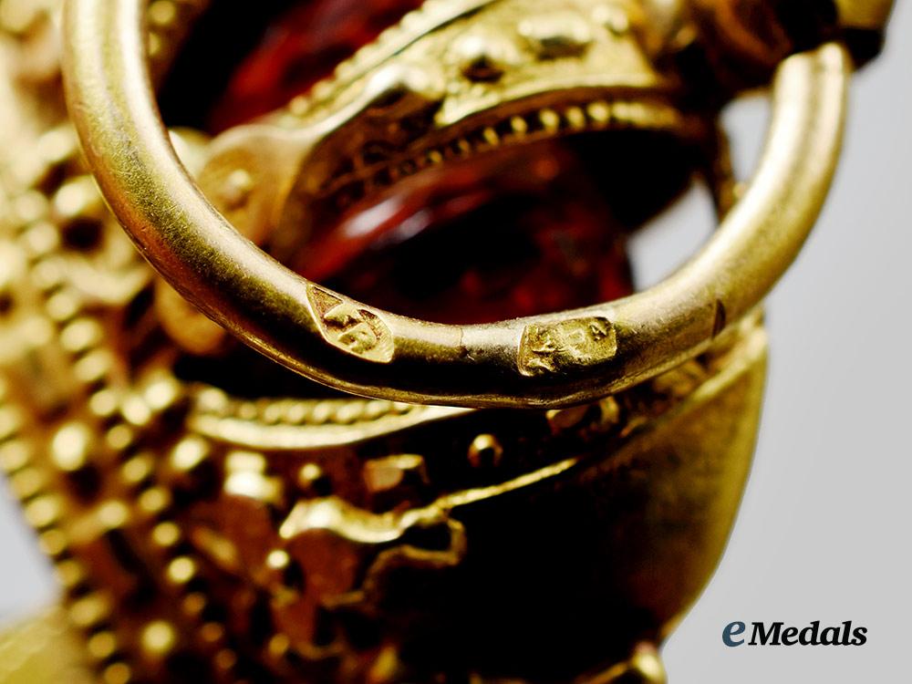 (Österreichisch-kaiserlicher Leopold-Orden). Instituted 1808. Type III. (1861-1918). In Gold, a beautiful red and white enamelled cross, the obverse medallion presenting the inscription FIA surrounded by a white ring inscribed INTEGRITATI ET MERITO, the reverse medallion features a white field inscribed OPES REGUM CORA SUBDITO RUM, surrounded by a Gold wreath, the badge is suspended from a large crown with an interior red enamelled cap, a green enamelled wreath below and waving pendilia on each side, measures 31.28 mm (w) x 62.13 mm (h – inclusive of cross adorned crown suspension), weighs 16.29 grams, partial marks on the integral ring, marked on the suspension ring with FR maker mark denoting Rothe, and a gold mark denoting Vienna manufacture between 1872-1922, worn on a trifold ribbon, small areas of enamel damage to the cross on the obverse and reverse, a scarce decoration in Gold, in extremely fine condition.