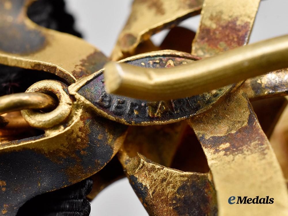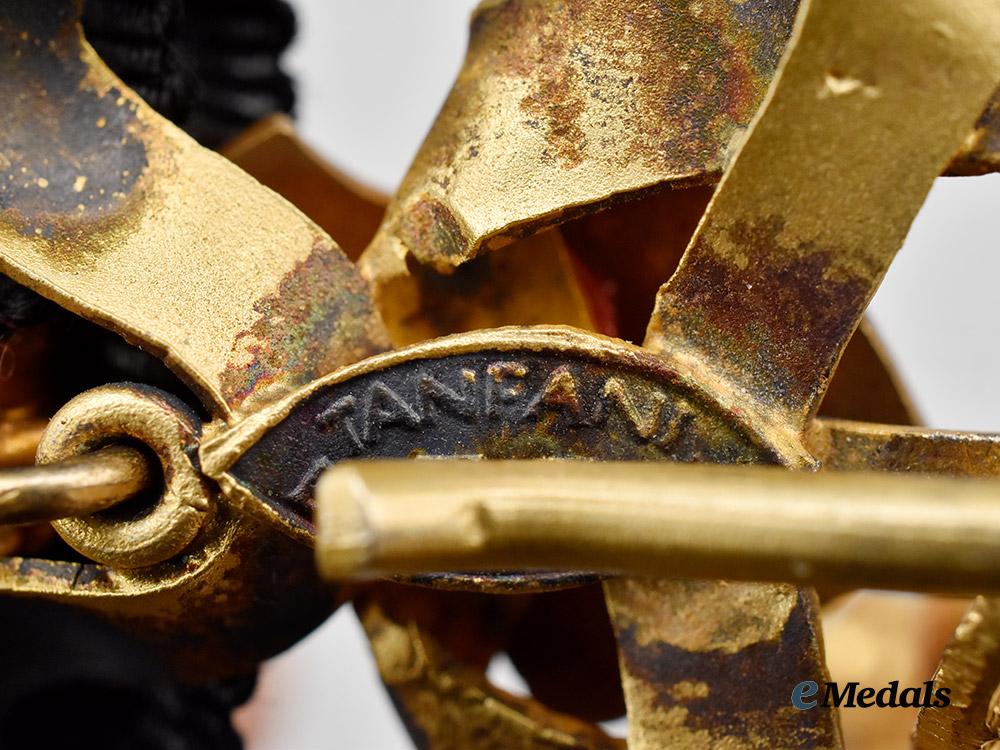 The Commander Cross Neck Badge. A Maltese Cross constructed of gilded silver with white enamelled arms on the obverse and reverse, with fleur-de-lies between the arms of the cross, suspended from a large hollow swivel crown and an elaborate ribbon bearing the Coat of Arms of the Order, on a long longitudinal loop for suspension from its period original and full length neck ribbon, marked TANFANI & BERTARELLI on the reverse of suspension, measuring 48.8 mm (w) x 114.7 mm (l), enamels intact, gilt wear evident, suspension bar is slightly bent between 12 o’clock arm and crown, remains in very fine condition.