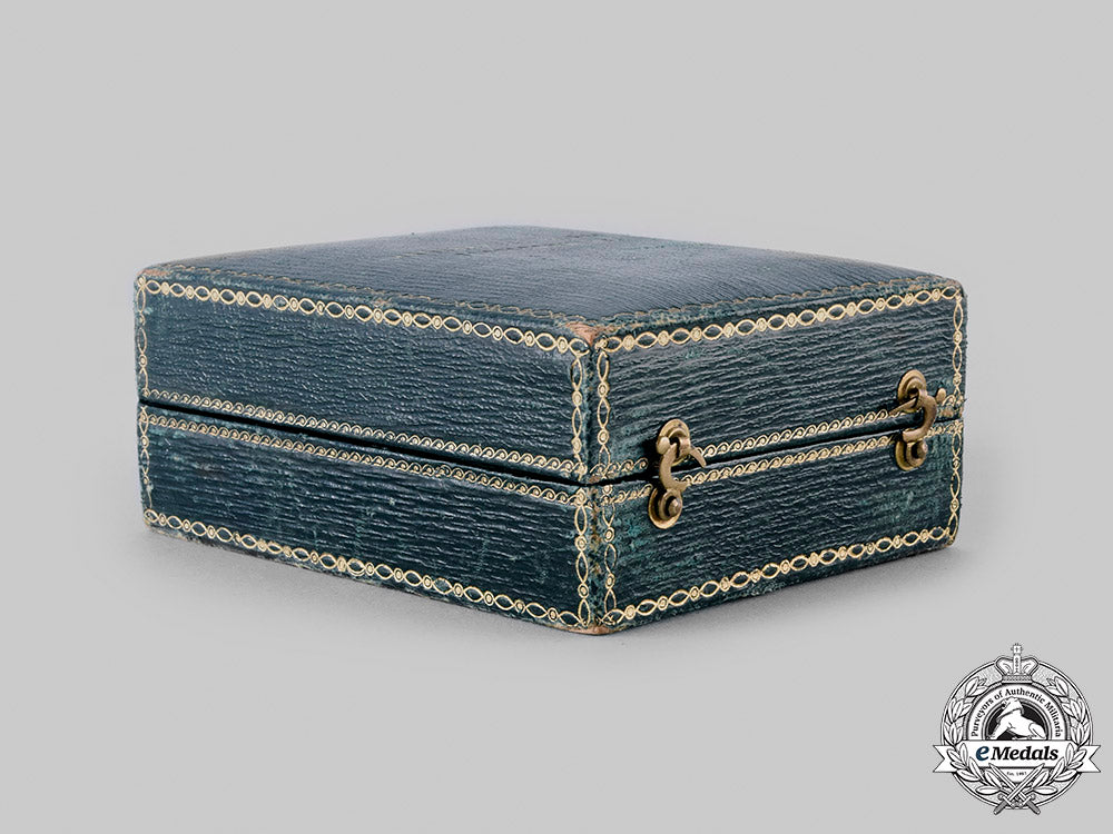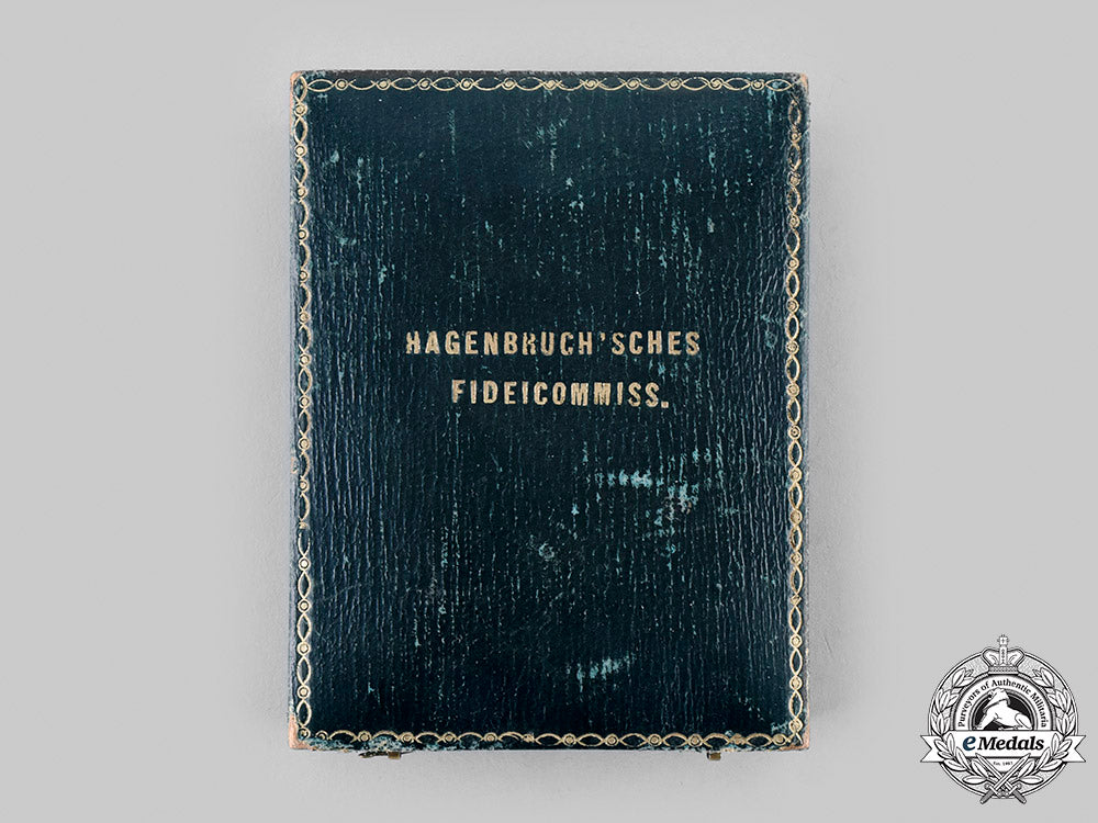 Of high quality manufacture, an extremely rare Renaissance-styled Order of St. John, consisting of a clear polished central genuine Quartz with multiple fine facets, contained within a frame of 18kt Gold shaping a sun with alternated enameled white and red rays, the obverse presenting a hand-made image of St. John in multi-colored enamel, with reverse framed by a fine enameled white Maltese Cross, measuring 59.09 mm (w) x 70.62 mm (h - inclusive the integral ring), weighing 99.6 grams, presenting light contact, an early piece in extremely good condition. Accompanied by a unique presentation case, consisting of a corrugated hard-structure green case in wood, with exterior adorned by ornamented gilded patterns on the edges, the exterior of the lid inscribed HAGENBRUCH’ SCHES FIDEICOMMISS (referring to inheritance of Hagenburgh family) with gilded lettering, the lid interior in white-cream silk, with medalbed in sloped blue velvet, measuring 73 mm (w) x 40 mm (h) x 98 mm (l), with functional two sliders and catches, presenting minor faded green and wearing surface along the case, light contact in the medalbed, otherwise a rare and unique historical piece in very good condition.