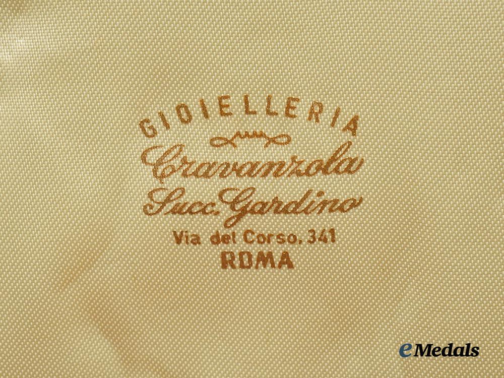 Contained in its original presentation case, constructed of a lightweight wooden core with a lightly textured red faux leather (leatherette) exterior, the exterior of the case embossed with a Maltese Cross in white, the interior of the lid lined with off-white padded silk, embossed with “Cravanzola, Roma”, with a functional exterior paper hinge, intact interior fabric hinge cover, and functional exterior metal clasp closure, measuring 110 mm (w) x 193 mm (l).