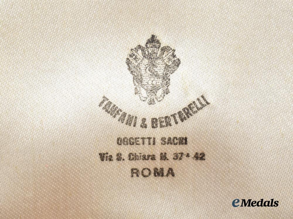 Contained in its original case of issue, a red leatherette exterior with white maltese cross on the lid, the interior lid marked TANFANI & BERTARELLI, with a dark red recessed medal bed, measures 103 mm (w) x 103 mm (h) x 24 mm (d), hinge and clasp functional, light wear, in extremely fine condition.