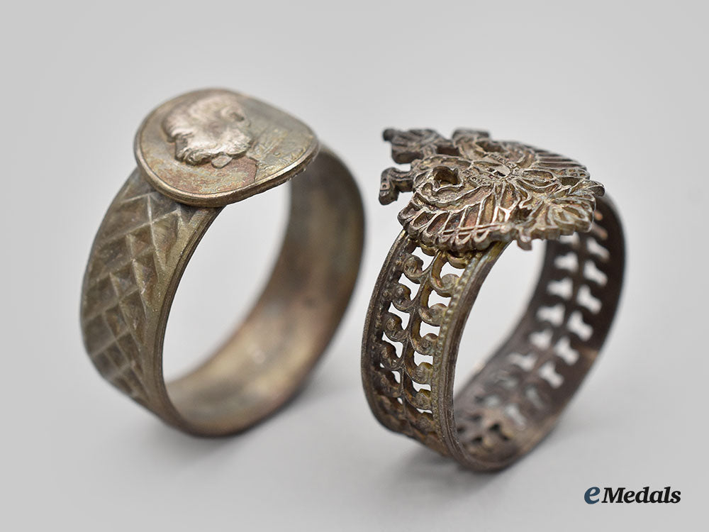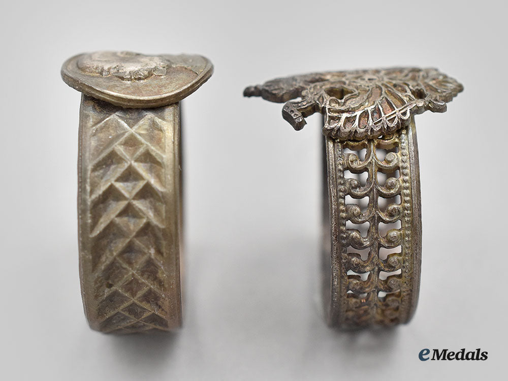 In silvered zinc, a ring presenting a carved floralesque band, the superimposed emblem presents the Austrian double headed eagle, measures 18.80mm (w) x 16.10mm (h of eagle), weighs 2.2 grams, size 5.25, small dent causing a slight misshape, dark patina, in very fine condition.