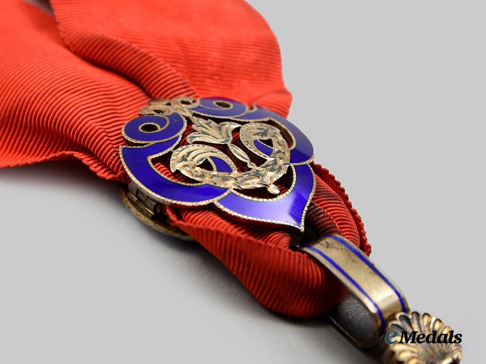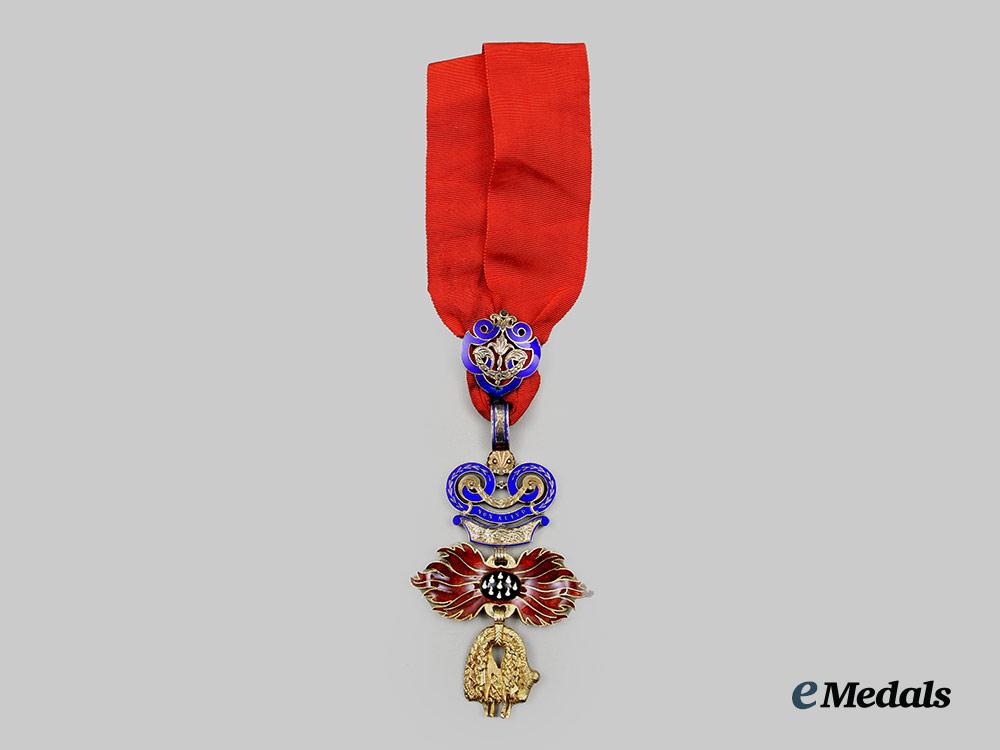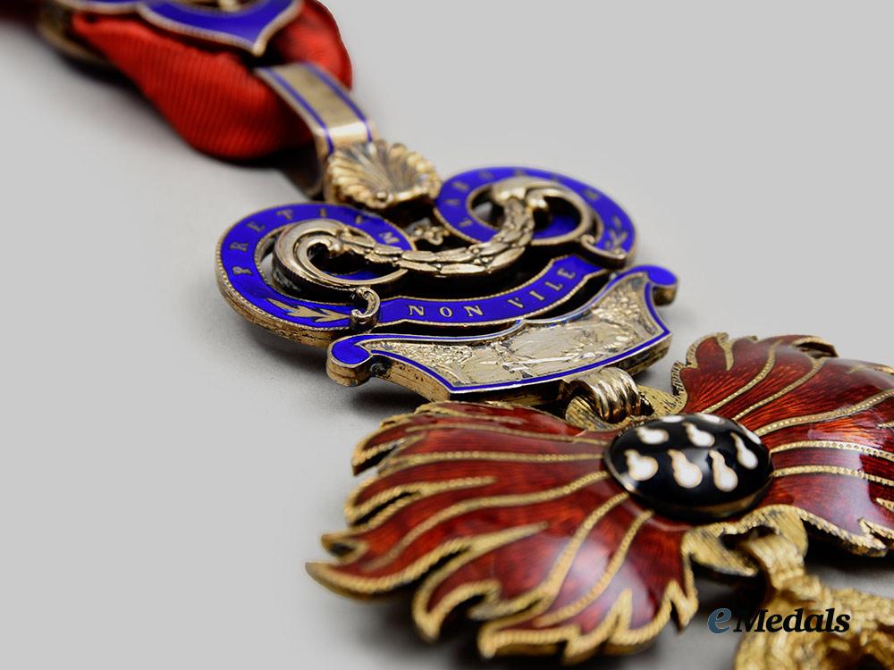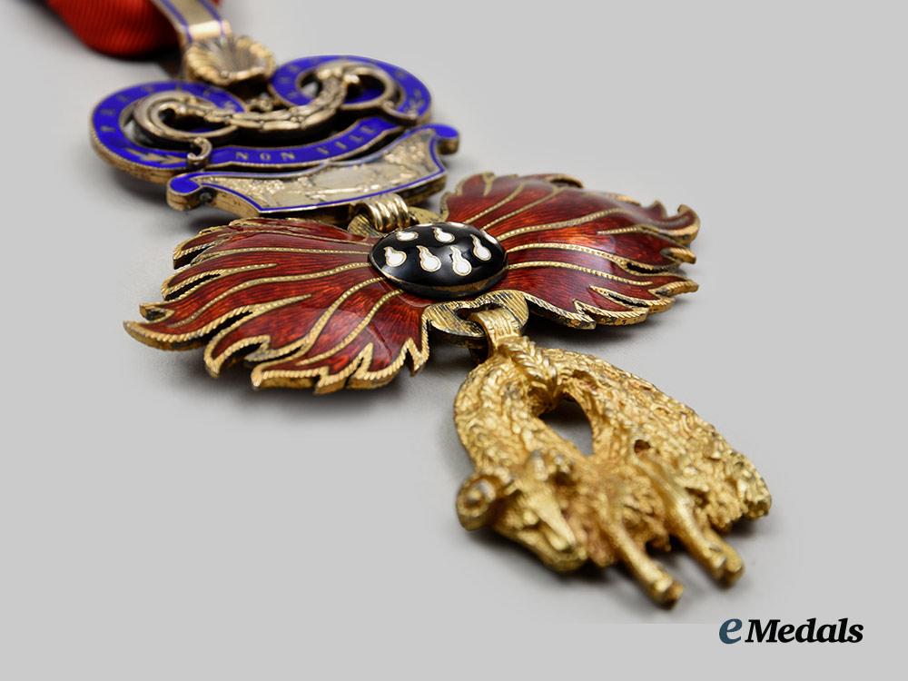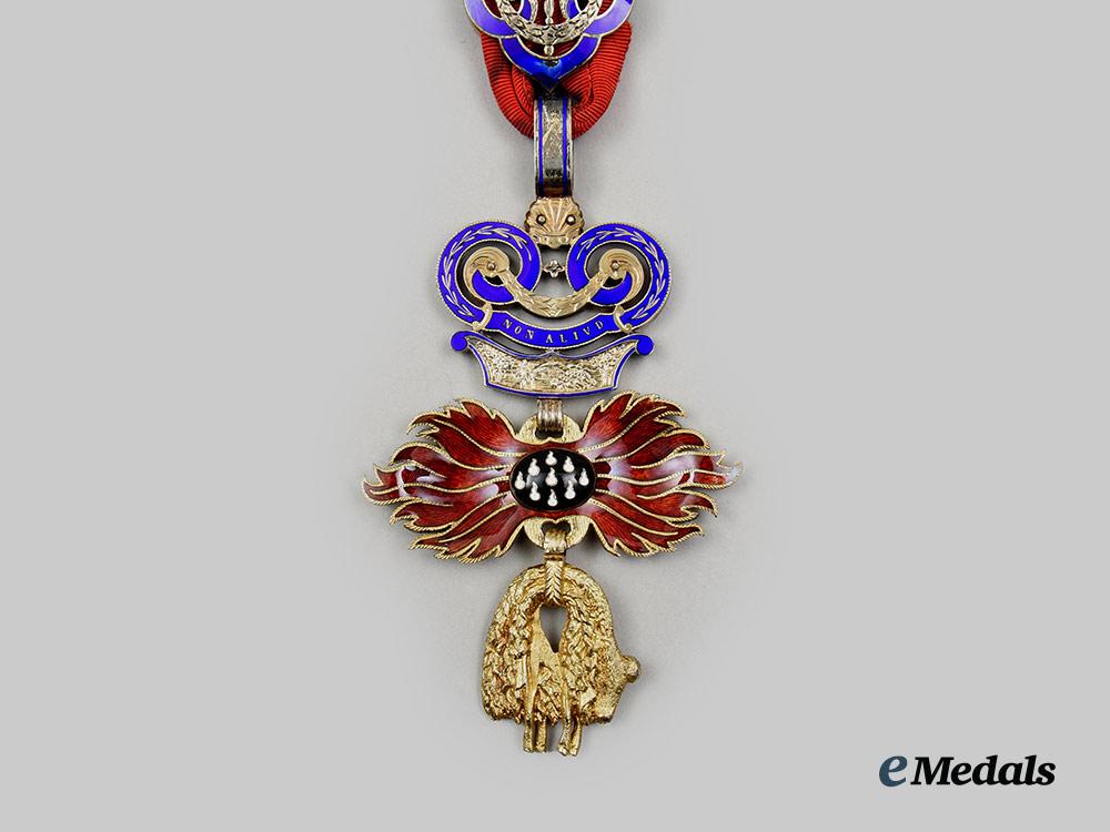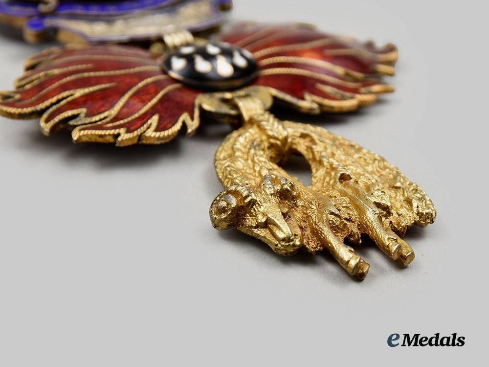 (Ritterorden vom Goldenen Vlies). Instituted January 10th 1429. (c. 1970 issue). A superb high quality museum exhibition example of this award, constructed of gilded bronze, consisting of an Austria’s typical facing-front heraldic figure of the Golden Fleece with details for the fur texture, attached on the top to a set of highly detailed Burgundy flames applique in splendid red enamels, with a central bulge medallion in black enamels and delineate enameled white sparks, surmounted by an adorned partially-enamelled decorative link in the form of a fire-steel striker, showing in relief a portrayal of Jason fighting the dragon beneath of the inscription PRETIUM LABORUM NON VILE (NO MEAN REWARD FOR LABOURS), on the reverse is a portrayal in relief of Gideon fighting the Midianites and above it the inscription NON ALIUD (I WILL HAVE NO OTHER), accompanied by a nicely ornamented partially-enamelled knot on the ribbon, measuring approximately 68.8 mm (w) x 118 mm (l) including its suspensions, a fine quality example in near mint condition.